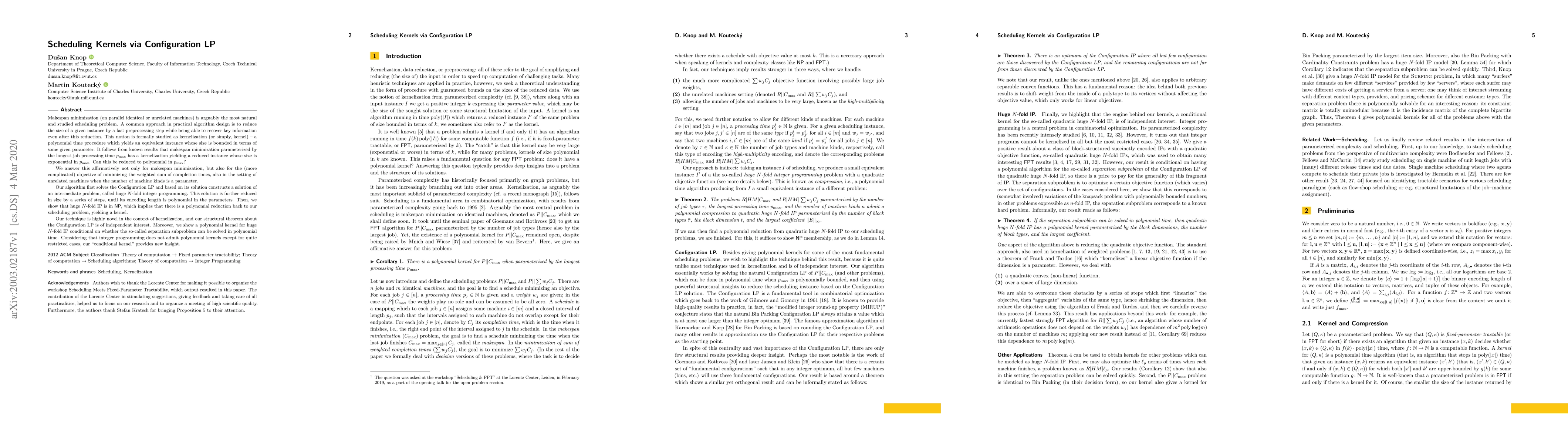 Makespan minimization (on parallel identical or unrelated machines) is arguably the most natural and studied scheduling problem. A common approach in practical algorithm design is to reduce the size of a given instance by a fast preprocessing step while being able to recover key information even after this reduction. This notion is formally studied as kernelization (or simply, kernel) -- a polynomial time procedure which yields an equivalent instance whose size is bounded in terms of some given parameter. It follows from known results that makespan minimization parameterized by the longest job processing time $p_{\max}$ has a kernelization yielding a reduced instance whose size is exponential in $p_{\max}$. Can this be reduced to polynomial in $p_{\max}$? We answer this affirmatively not only for makespan minimization, but also for the (more complicated) objective of minimizing the weighted sum of completion times, also in the setting of unrelated machines when the number of machine kinds is a parameter. Our algorithm first solves the Configuration LP and based on its solution constructs a solution of an intermediate problem, called huge $N$-fold integer programming. This solution is further reduced in size by a series of steps, until its encoding length is polynomial in the parameters. Then, we show that huge $N$-fold IP is in NP, which implies that there is a polynomial reduction back to our scheduling problem, yielding a kernel. Our technique is highly novel in the context of kernelization, and our structural theorem about the Configuration LP is of independent interest. Moreover, we show a polynomial kernel for huge $N$-fold IP conditional on whether the so-called separation subproblem can be solved in polynomial time. Considering that integer programming does not admit polynomial kernels except for quite restricted cases, our "conditional kernel" provides new insight.