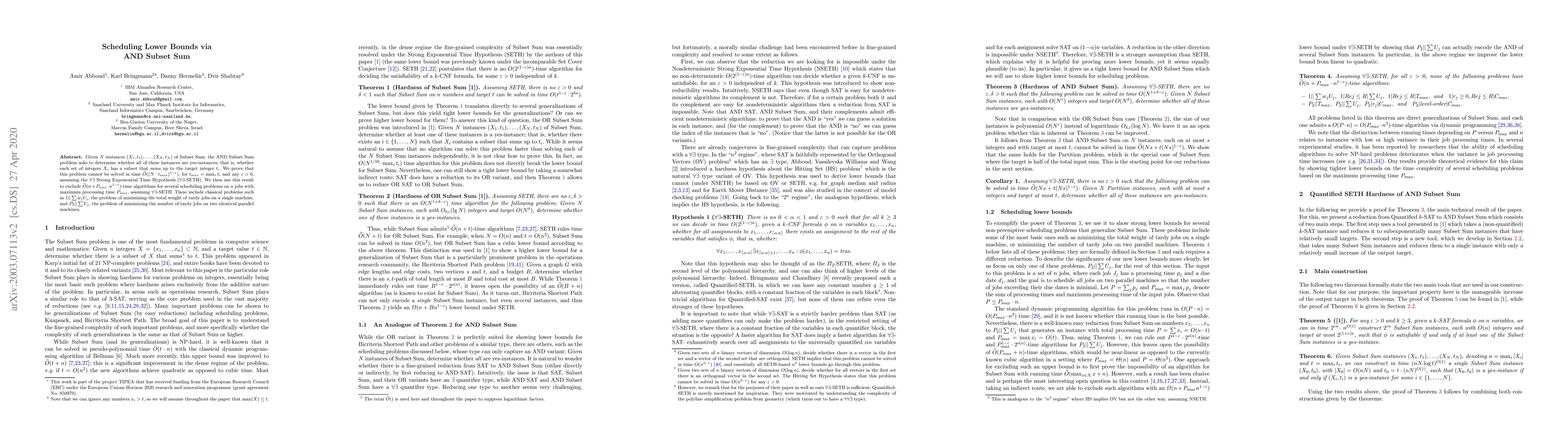 Given $N$ instances $(X_1,t_1),\ldots,(X_N,t_N)$ of Subset Sum, the AND Subset Sum problem asks to determine whether all of these instances are yes-instances; that is, whether each set of integers $X_i$ has a subset that sums up to the target integer $t_i$. We prove that this problem cannot be solved in time $\tilde{O}((N \cdot t_{max})^{1-\epsilon})$, for $t_{max}=\max_i t_i$ and any $\epsilon > 0$, assuming the $\forall \exists$ Strong Exponential Time Hypothesis ($\forall \exists$-SETH). We then use this result to exclude $\tilde{O}(n+P_{max} \cdot n^{1-\epsilon})$-time algorithms for several scheduling problems on $n$ jobs with maximum processing time $P_{max}$, based on $\forall \exists$-SETH. These include classical problems such as $1||\sum w_jU_j$, the problem of minimizing the total weight of tardy jobs on a single machine, and $P_2||\sum U_j$, the problem of minimizing the number of tardy jobs on two identical parallel machines.