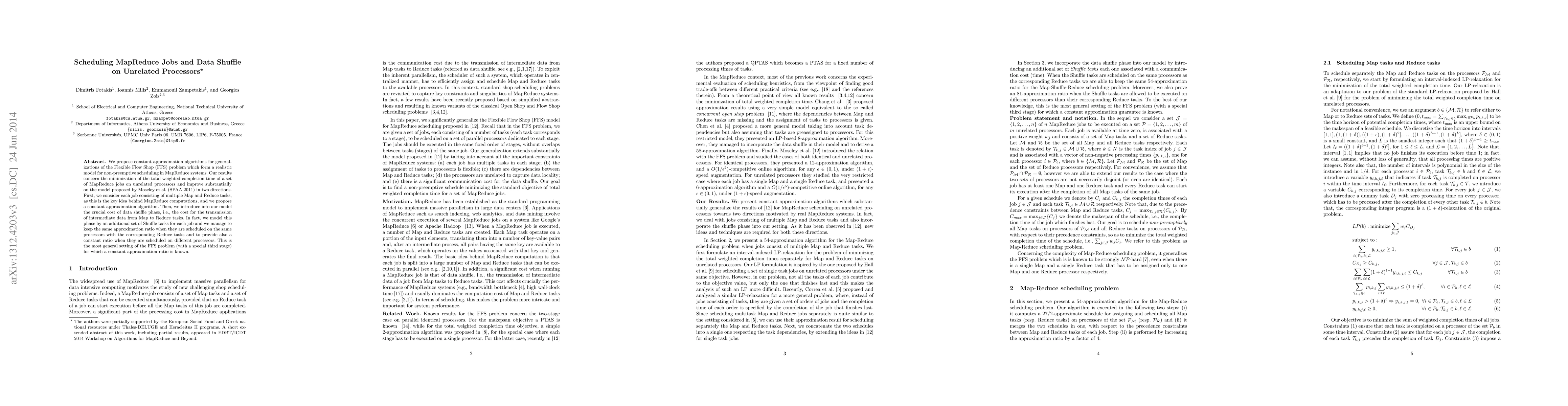 This paper proposes constant approximation algorithms for scheduling MapReduce jobs on unrelated processors, considering both Map and Reduce tasks and incorporating the cost of data shuffle. It improves upon previous models by including a realistic data shuffle phase and provides a constant approximation ratio for both shared and separate processor scheduling.