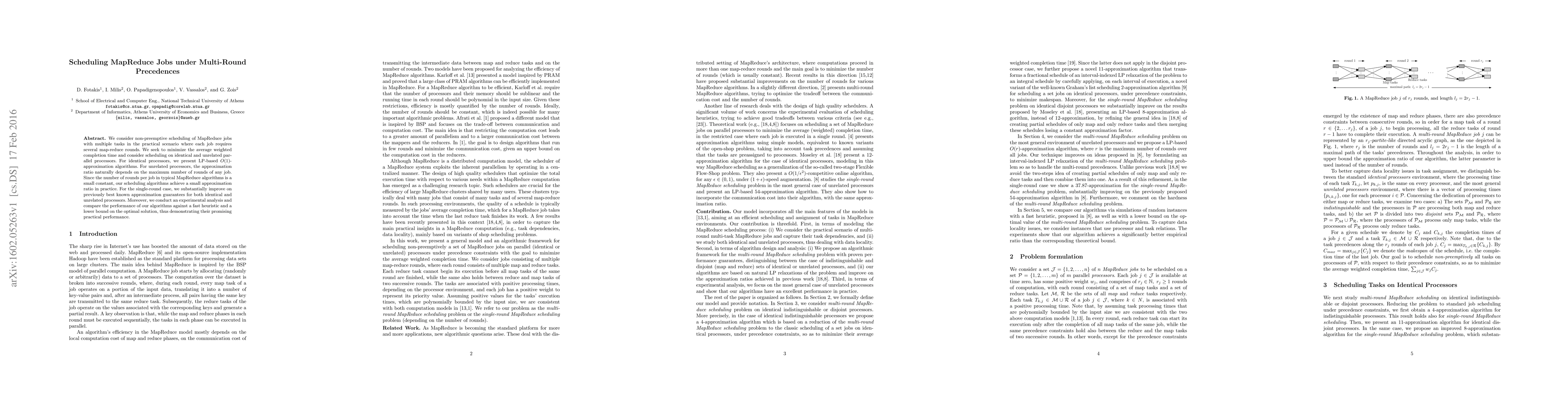 This paper presents scheduling algorithms for MapReduce jobs with multi-round precedences to minimize average weighted completion time on both identical and unrelated parallel processors. It achieves O(1)-approximation for identical processors and a small approximation ratio for unrelated processors due to typically small round constants in MapReduce jobs.