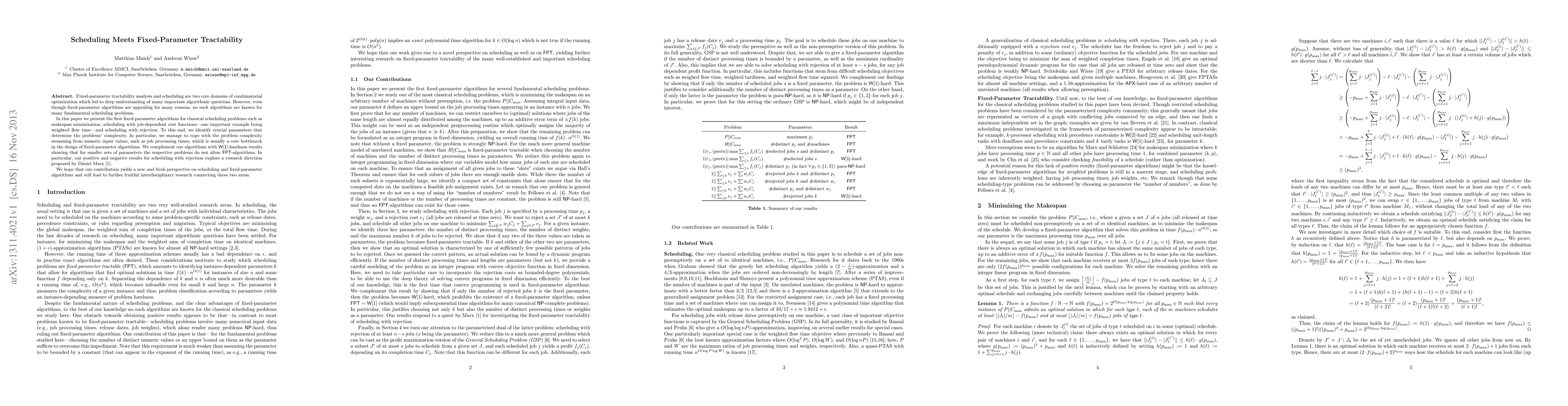 This paper introduces the first fixed-parameter tractable algorithms for classical scheduling problems like makespan minimization and scheduling with rejection, addressing the complexity from numeric inputs. It also presents W[1]-hardness results for certain parameters, highlighting the interdisciplinary potential of combining scheduling with fixed-parameter tractability.