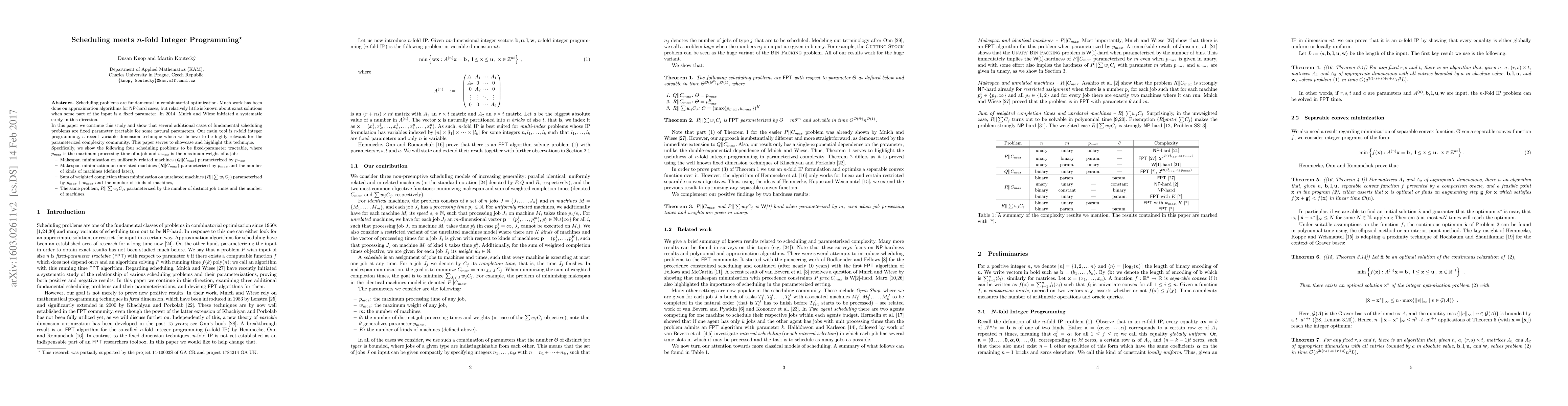 Scheduling problems are fundamental in combinatorial optimization. Much work has been done on approximation algorithms for NP-hard cases, but relatively little is known about exact solutions when some part of the input is a fixed parameter. In 2014, Mnich and Wiese initiated a systematic study in this direction. In this paper we continue this study and show that several additional cases of fundamental scheduling problems are fixed parameter tractable for some natural parameters. Our main tool is n-fold integer programming, a recent variable dimension technique which we believe to be highly relevant for the parameterized complexity community. This paper serves to showcase and highlight this technique. Specifically, we show the following four scheduling problems to be fixed-parameter tractable, where p max is the maximum processing time of a job and w max is the maximum weight of a job: - Makespan minimization on uniformly related machines $(Q||C_{max} )$ parameterized by $p_{max}$, - Makespan minimization on unrelated machines $(R||C_{max} )$ parameterized by $p_{max}$ and the number of kinds of machines, - Sum of weighted completion times minimization on unrelated machines $(R|| \sum w_i C_i )$ parameterized by $p_{max} + w_{max}$ and the number of kinds of machines, - The same problem, $(R|| \sum w_i C_i),$ parameterized by the number of distinct job times and the number of machines.