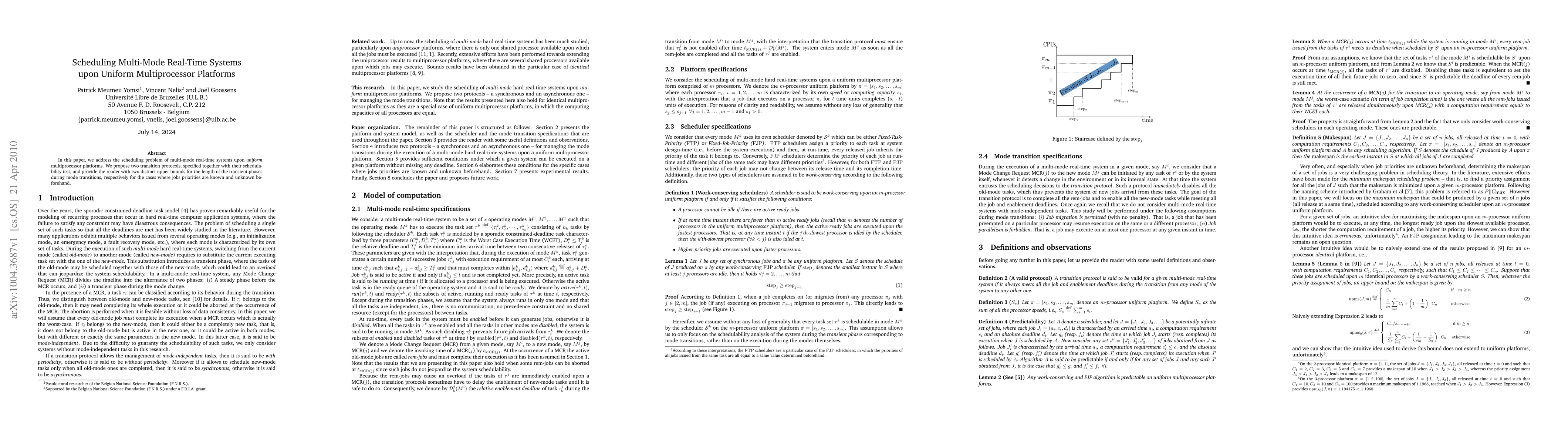 This paper proposes two transition protocols for scheduling multi-mode real-time systems on uniform multiprocessor platforms, along with a schedulability test. It also provides upper bounds for transient phase lengths during mode transitions, considering scenarios with known and unknown job priorities.