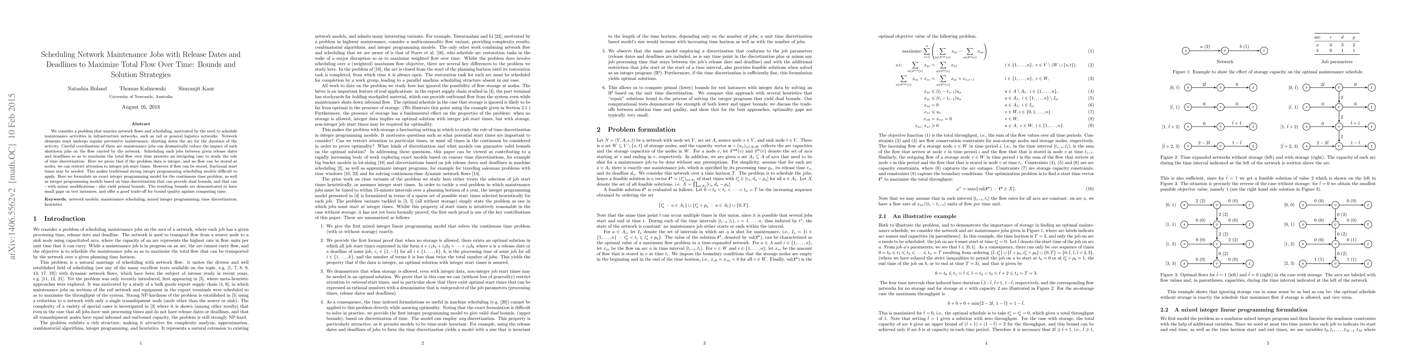 We consider a problem that marries network flows and scheduling, motivated by the need to schedule maintenance activities in infrastructure networks, such as rail or general logistics networks. Network elements must undergo regular preventive maintenance, shutting down the arc for the duration of the activity. Careful coordination of these arc maintenance jobs can dramatically reduce the impact of such shutdown jobs on the flow carried by the network. Scheduling such jobs between given release dates and deadlines so as to maximize the total flow over time presents an intriguing case to study the role of time discretization. Here we prove that if the problem data is integer, and no flow can be stored at nodes, we can restrict attention to integer job start times. However if flow can be stored, fractional start times may be needed. This makes traditional strong integer programming scheduling models difficult to apply. Here we formulate an exact integer programming model for the continuous time problem, as well as integer programming models based on time discretization that can provide dual bounds, and that can - with minor modifications - also yield primal bounds. The resulting bounds are demonstrated to have small gaps on test instances, and offer a good trade-off for bound quality against computing time.