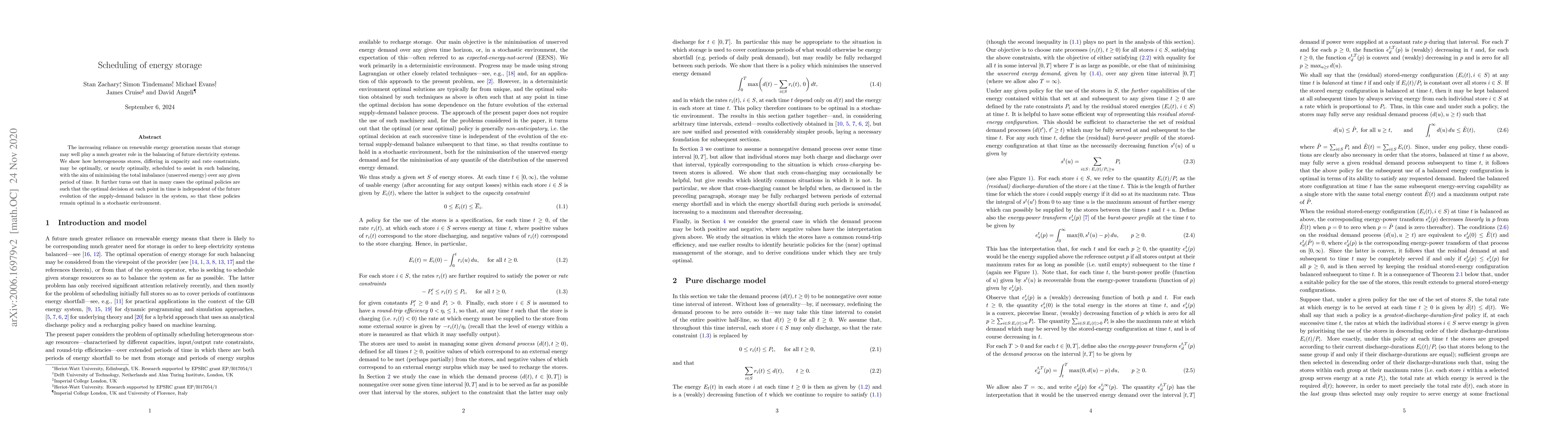 The increasing reliance on renewable energy generation means that storage may well play a much greater role in the balancing of future electricity systems. We show how heterogeneous stores, differing in capacity and rate constraints, may be optimally, or nearly optimally, scheduled to assist in such balancing, with the aim of minimising the total imbalance (unserved energy) over any given period of time. It further turns out that in many cases the optimal policies are such that the optimal decision at each point in time is independent of the future evolution of the supply-demand balance in the system, so that these policies remain optimal in a stochastic environment.