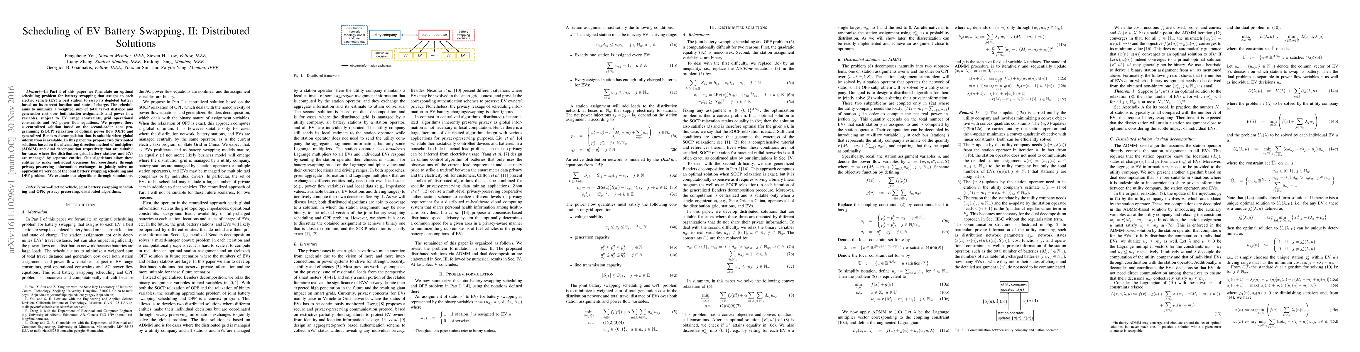 In Part I of this paper we formulate an optimal scheduling problem for battery swapping that assigns to each electric vehicle (EV) a best station to swap its depleted battery based on its current location and state of charge. The schedule aims to minimize a weighted sum of total travel distance and generation cost over both station assignments and power flow variables, subject to EV range constraints, grid operational constraints and AC power flow equations. We propose there a centralized solution based on the second-order cone programming (SOCP) relaxation of optimal power flow (OPF) and generalized Benders decomposition that is suitable when global information is available. In this paper we propose two distributed solutions based on the alternating direction method of multipliers (ADMM) and dual decomposition respectively that are suitable for cases where the distribution grid, battery stations and EVs are managed by separate entities. Our algorithms allow these entities to make individual decisions but coordinate through privacy-preserving information exchanges to jointly solve an approximate version of the joint battery swapping scheduling and OPF problem. We evaluate our algorithms through simulations.