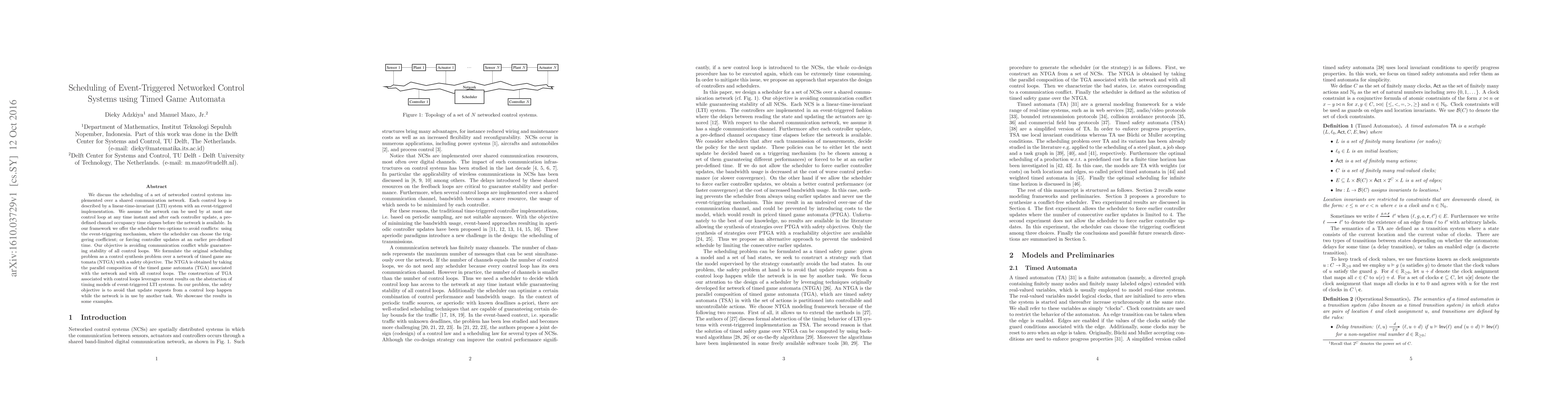 This paper presents a scheduling method for event-triggered networked control systems to avoid communication conflicts while ensuring stability. The approach uses timed game automata to model the scheduling problem and offers two options to manage network access, aiming to maintain system safety.