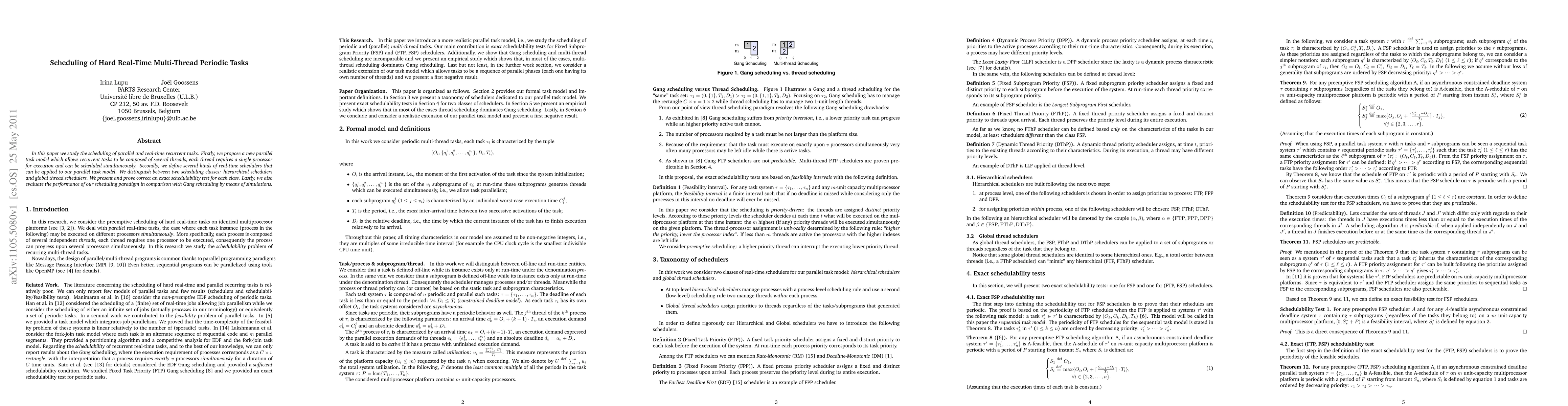 In this paper we study the scheduling of parallel and real-time recurrent tasks. Firstly, we propose a new parallel task model which allows recurrent tasks to be composed of several threads, each thread requires a single processor for execution and can be scheduled simultaneously. Secondly, we define several kinds of real-time schedulers that can be applied to our parallel task model. We distinguish between two scheduling classes: hierarchical schedulers and global thread schedulers. We present and prove correct an exact schedulability test for each class. Lastly, we also evaluate the performance of our scheduling paradigm in comparison with Gang scheduling by means of simulations.