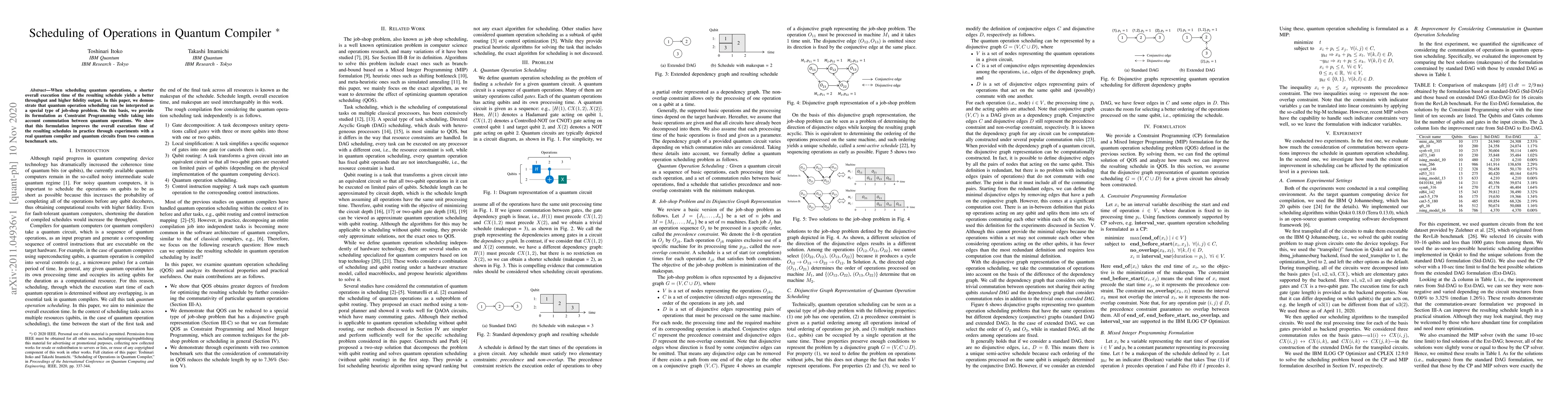 When scheduling quantum operations, a shorter overall execution time of the resulting schedule yields a better throughput and higher fidelity output. In this paper, we demonstrate that quantum operation scheduling can be interpreted as a special type of job-shop problem. On this basis, we provide its formulation as Constraint Programming while taking into account commutation between quantum operations. We show that this formulation improves the overall execution time of the resulting schedules in practice through experiments with a real quantum compiler and quantum circuits from two common benchmark sets.