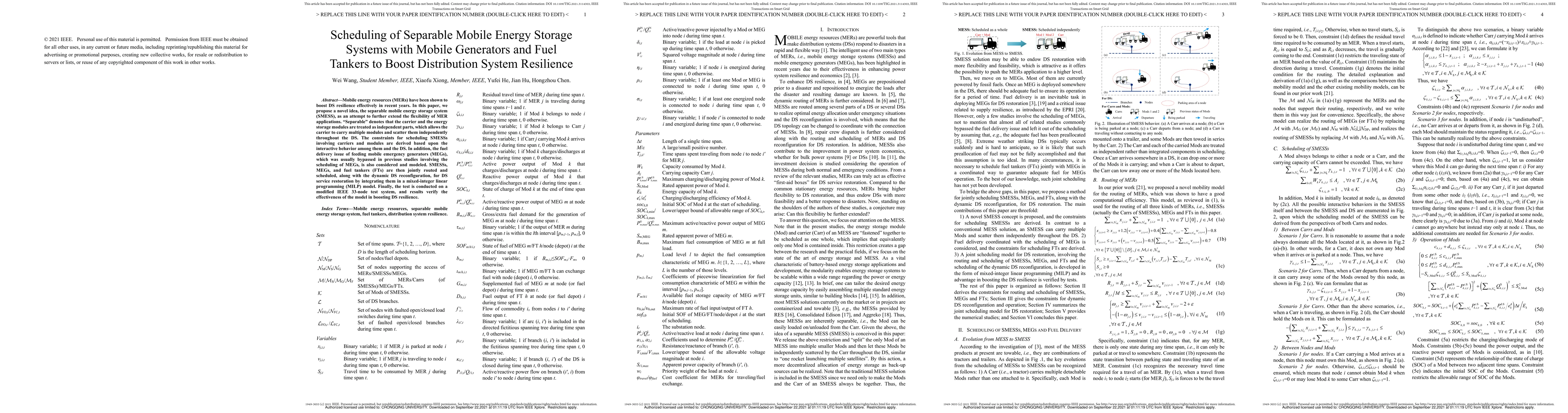 This paper proposes a novel separable mobile energy storage system (SMESS) to enhance distribution system resilience by independently deploying storage modules and carriers. A mixed-integer linear programming model integrates SMESSs, mobile emergency generators, and fuel tankers for dynamic scheduling and service restoration, validated on a modified IEEE 33-node system.