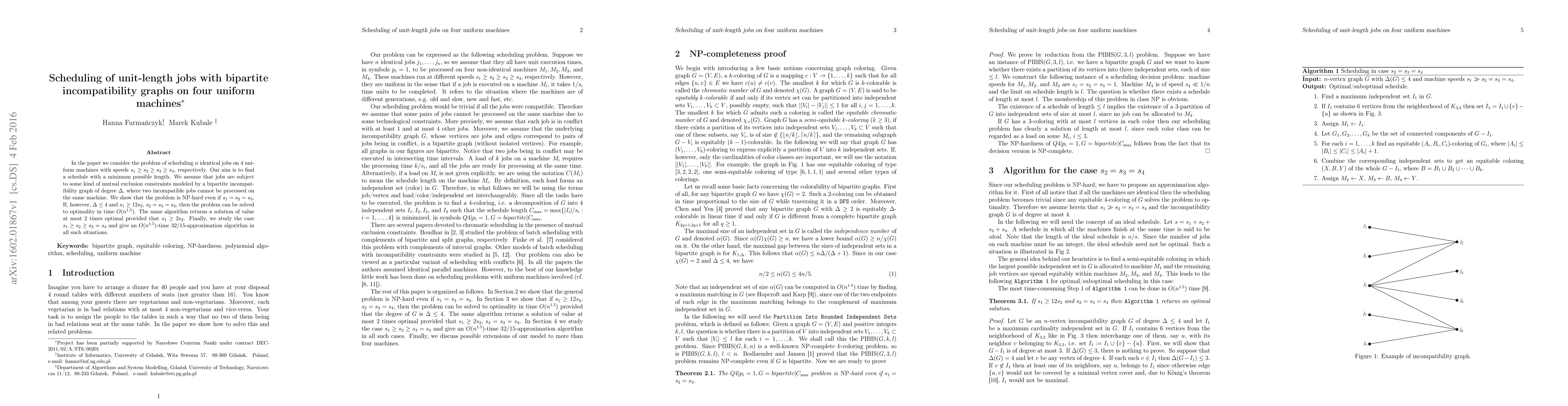 In the paper we consider the problem of scheduling $n$ identical jobs on 4 uniform machines with speeds $s_1 \geq s_2 \geq s_3 \geq s_4,$ respectively. Our aim is to find a schedule with a minimum possible length. We assume that jobs are subject to some kind of mutual exclusion constraints modeled by a bipartite incompatibility graph of degree $\Delta$, where two incompatible jobs cannot be processed on the same machine. We show that the problem is NP-hard even if $s_1=s_2=s_3$. If, however, $\Delta \leq 4$ and $s_1 \geq 12 s_2$, $s_2=s_3=s_4$, then the problem can be solved to optimality in time $O(n^{1.5})$. The same algorithm returns a solution of value at most 2 times optimal provided that $s_1 \geq 2s_2$. Finally, we study the case $s_1 \geq s_2 \geq s_3=s_4$ and give an $O(n^{1.5})$-time $32/15$-approximation algorithm in all such situations.