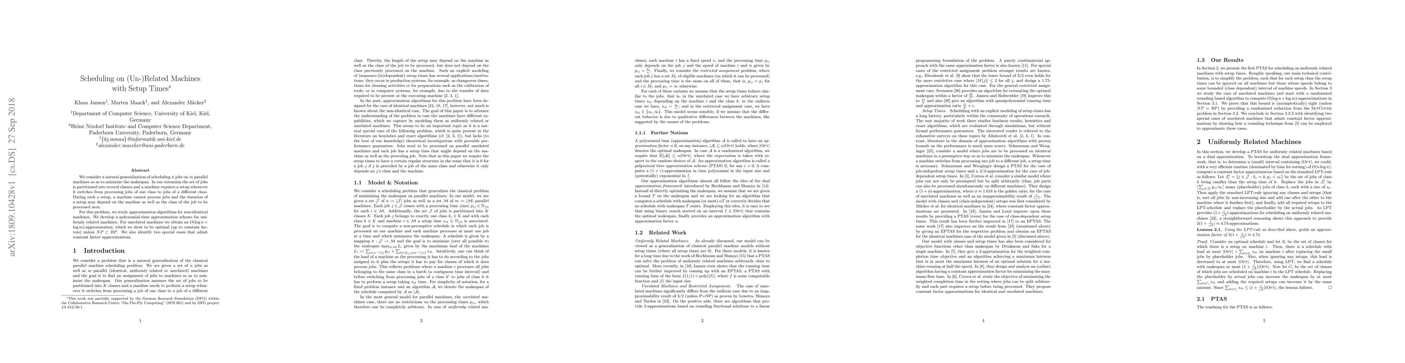 The development of a polynomial-time approximation scheme for uniformly related machines with setup times and an $O(\log n + \log m)$-approximation for unrelated machines, along with the identification of special cases admitting constant factor approximations.