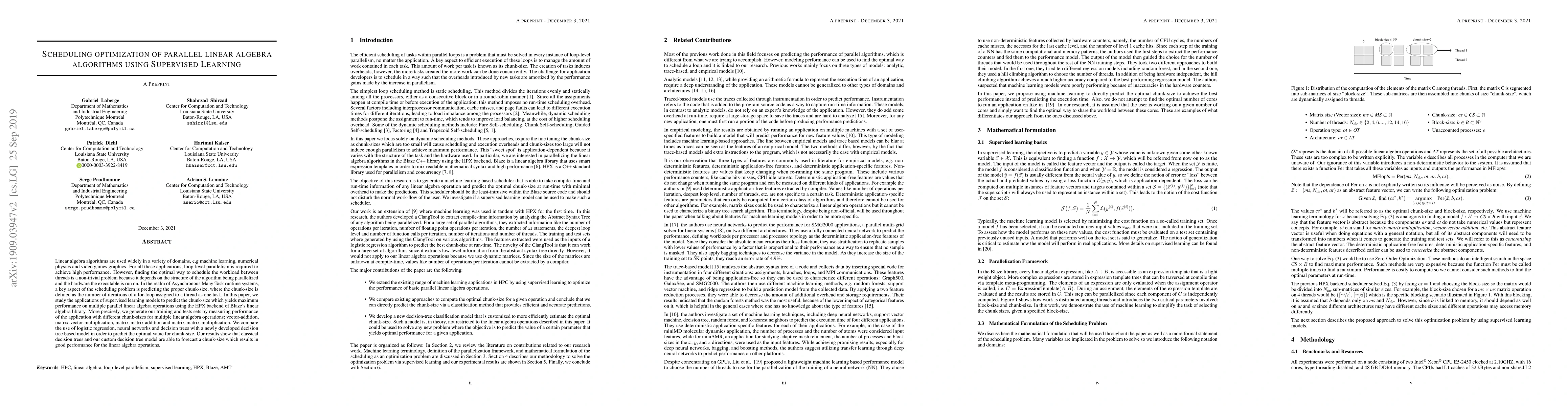 This paper explores the use of supervised learning models to optimize the scheduling of parallel linear algebra algorithms by predicting the optimal chunk-size for performance maximization. The study compares logistic regression, neural networks, and decision trees against a custom decision tree model to determine the best predictor for chunk-size in various parallel linear algebra operations, showing that both classical and custom decision trees yield effective chunk-size predictions.