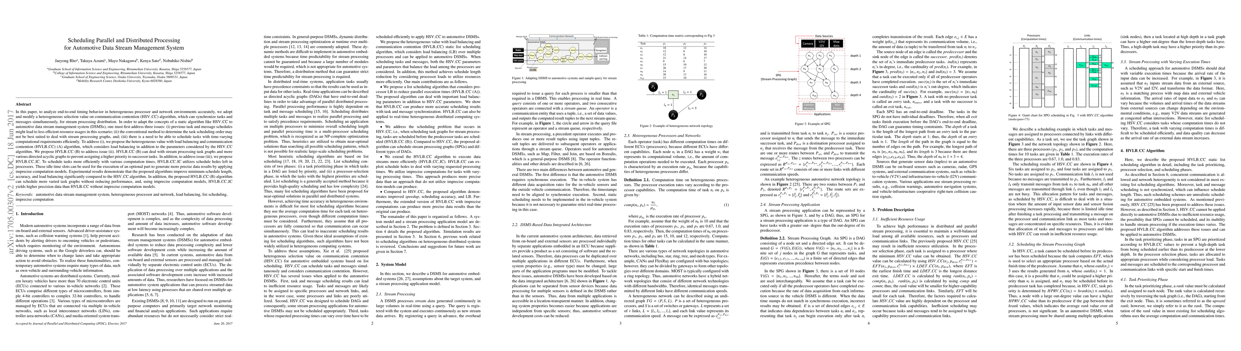 In this paper, to analyze end-to-end timing behavior in heterogeneous processor and network environments accurately, we adopt a heterogeneous selection value on communication contention (HSV_CC) algorithm, which can synchronize tasks and messages simultaneously, for stream processing distribution. In order to adapt HSV_CC to automotive data stream management system (DSMSs), one must address three issues: (i) previous task and message schedules might lead to less efficient resource usages; (ii) the conventional method to determine the task scheduling order may not be best suited to deal with stream processing graphs, and; (iii) there is a need to be able to schedule tasks with time-varying computational requirements efficiently. To address (i), we propose the heterogeneous value with load balancing and communication contention (HVLB_CC) (A) algorithm, which considers load balancing in addition to the parameters considered by the HSV_CC algorithm. We propose HVLB_CC (B) to address issue (ii). HVLB_CC (B) can deal with stream processing task graphs and more various directed acyclic graphs to prevent assigning a higher priority to successor tasks. In addition, to address issue (iii), we propose HVLB_CC_IC. To schedule tasks more efficiently with various computation times, HVLB_CC_IC utilizes schedule holes left in processors. These idle time slots can be used for the execution of an optional part to generate more precise data results by applying imprecise computation models. Experimental results demonstrate that the proposed algorithms improve minimum schedule length, accuracy, and load balancing significantly compared to the HSV_CC algorithm. In addition, the proposed HVLB_CC (B) algorithm can schedule more varied task graphs without reducing performance, and, using imprecise computation models, HVLB_CC_IC yields higher precision data than HVLB_CC without imprecise computation models.
