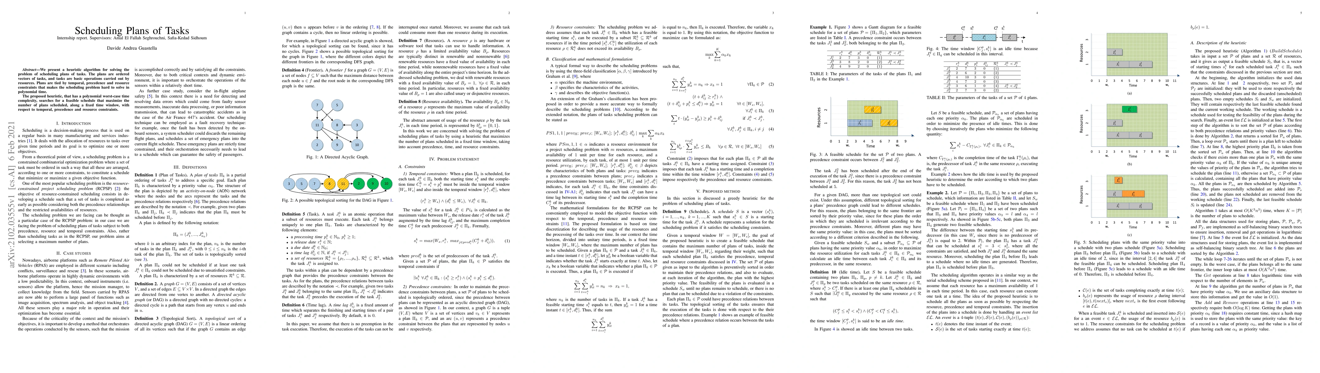 A heuristic algorithm is proposed to solve scheduling plans of tasks with temporal, precedence, and resource constraints, maximizing plan schedules within a fixed time window.