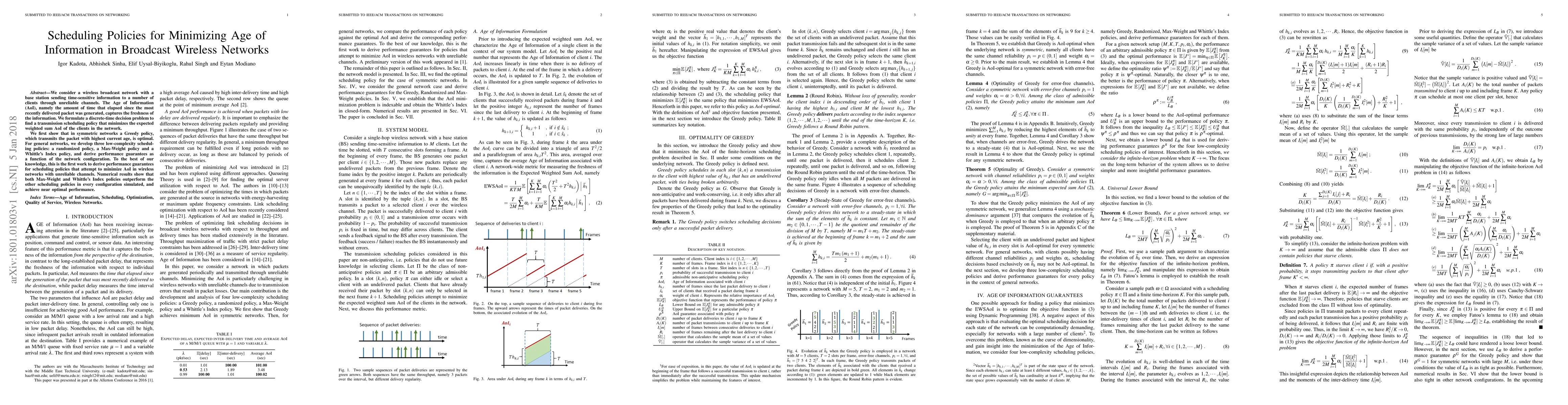 This paper investigates scheduling policies in wireless broadcast networks to minimize the Age of Information (AoI), which measures the freshness of information. It finds that a Greedy policy is optimal in symmetric networks, while three low-complexity policies—randomized, Max-Weight, and Whittle's Index—are effective for general networks, with numerical results showing Max-Weight and Whittle's Index policies achieving near-optimal performance.