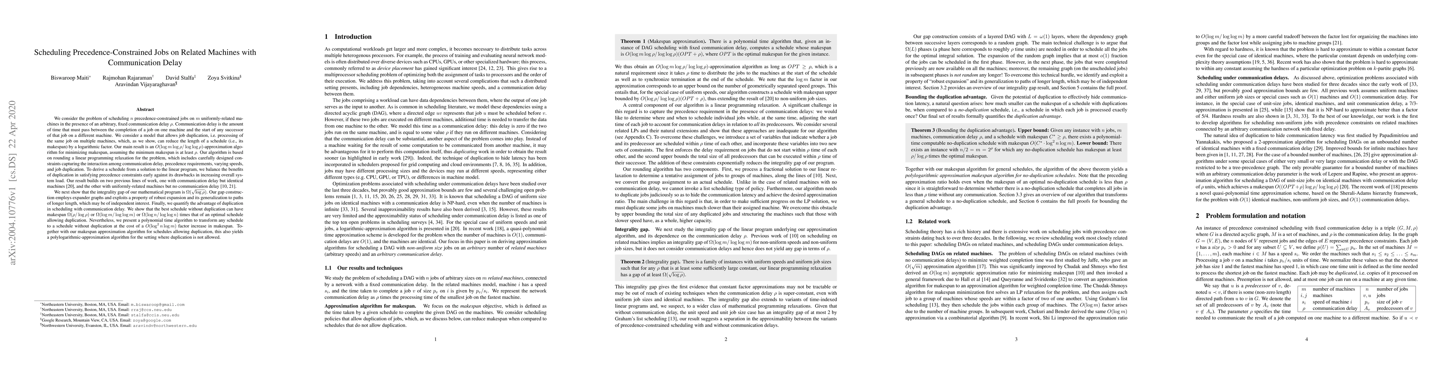 Researchers developed an algorithm to schedule jobs on machines with a fixed communication delay, allowing job duplication to reduce schedule length by a logarithmic factor. The algorithm achieves an approximation of the minimum makespan in O(log m log rho / log log rho) time.
