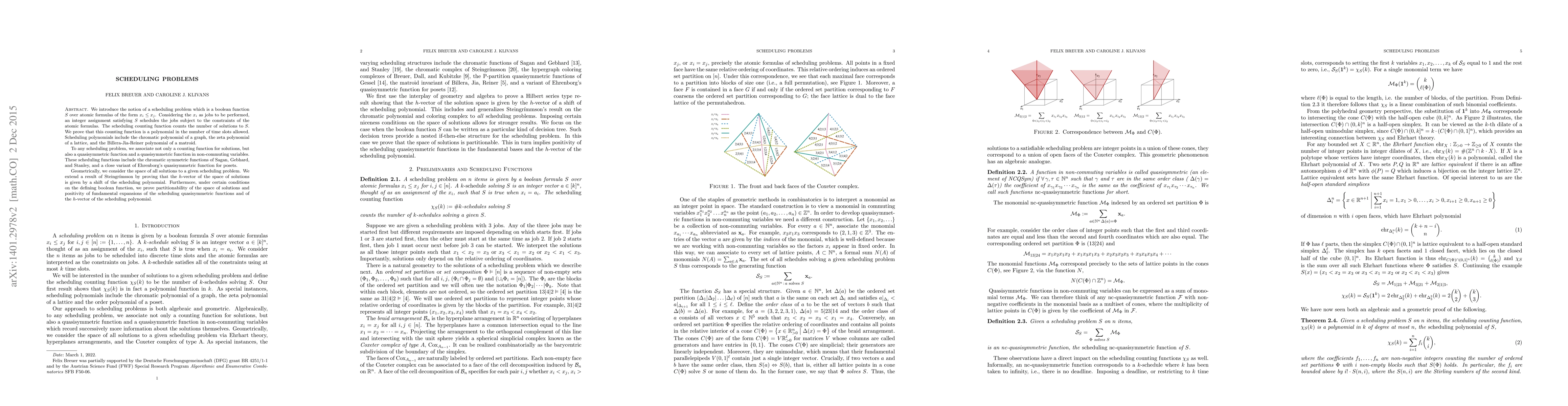 This paper introduces scheduling problems as boolean functions over constraints on job assignments, proving that their counting function is polynomial. It associates scheduling problems with quasisymmetric functions and extends results on the geometry of solution spaces, proving partitionability and positivity under certain conditions.