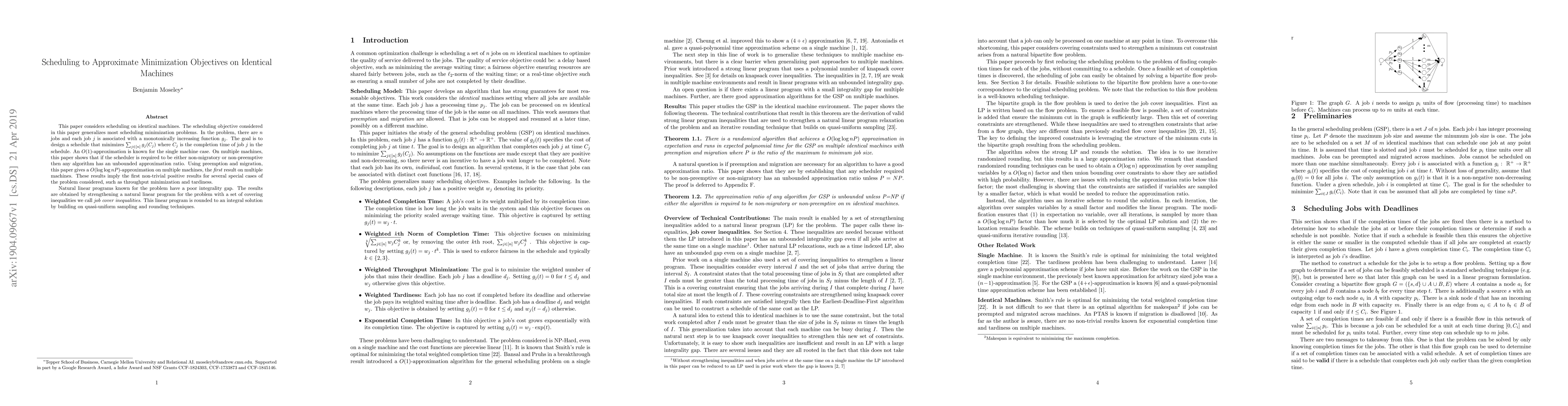 This paper considers scheduling on identical machines. The scheduling objective considered in this paper generalizes most scheduling minimization problems. In the problem, there are $n$ jobs and each job $j$ is associated with a monotonically increasing function $g_j$. The goal is to design a schedule that minimizes $\sum_{j \in [n]} g_{j}(C_j)$ where $C_j$ is the completion time of job $j$ in the schedule. An $O(1)$-approximation is known for the single machine case. On multiple machines, this paper shows that if the scheduler is required to be either non-migratory or non-preemptive then any algorithm has an unbounded approximation ratio. Using preemption and migration, this paper gives a $O(\log \log nP)$-approximation on multiple machines, the first result on multiple machines. These results imply the first non-trivial positive results for several special cases of the problem considered, such as throughput minimization and tardiness. Natural linear programs known for the problem have a poor integrality gap. The results are obtained by strengthening a natural linear program for the problem with a set of covering inequalities we call job cover inequalities. This linear program is rounded to an integral solution by building on quasi-uniform sampling and rounding techniques.