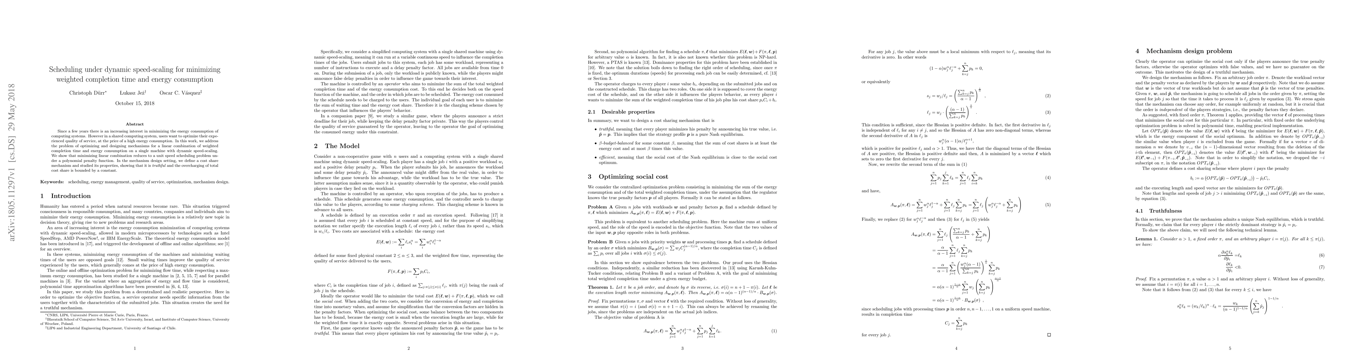 This paper explores scheduling strategies for minimizing a weighted combination of completion time and energy consumption in shared computing systems using dynamic speed-scaling. It proposes a truthful cost-sharing mechanism that bounds overcharging, demonstrating its effectiveness under a polynomial penalty function.