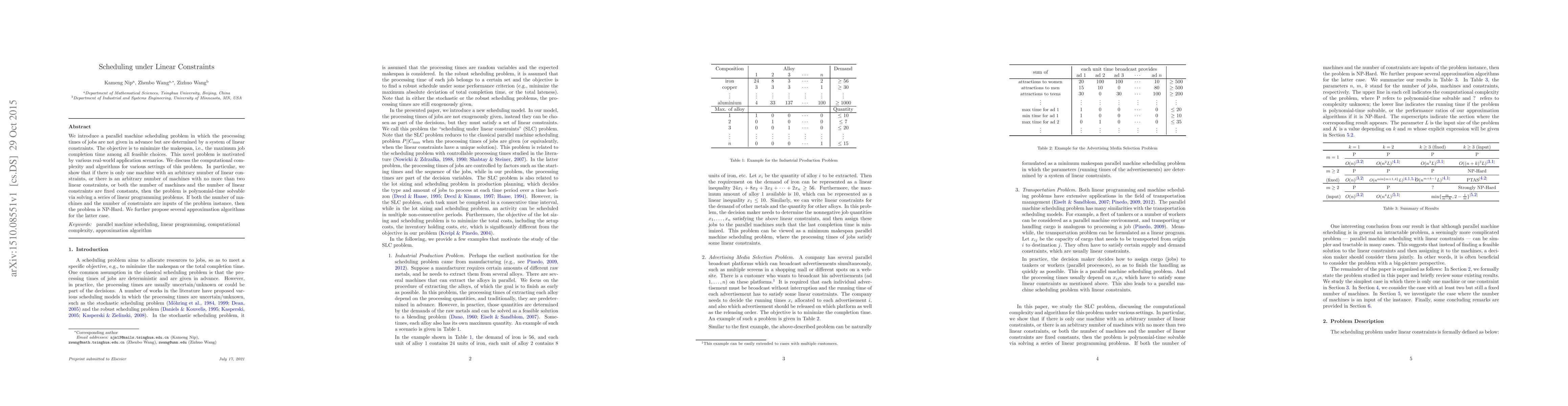 We introduce a parallel machine scheduling problem in which the processing times of jobs are not given in advance but are determined by a system of linear constraints. The objective is to minimize the makespan, i.e., the maximum job completion time among all feasible choices. This novel problem is motivated by various real-world application scenarios. We discuss the computational complexity and algorithms for various settings of this problem. In particular, we show that if there is only one machine with an arbitrary number of linear constraints, or there is an arbitrary number of machines with no more than two linear constraints, or both the number of machines and the number of linear constraints are fixed constants, then the problem is polynomial-time solvable via solving a series of linear programming problems. If both the number of machines and the number of constraints are inputs of the problem instance, then the problem is NP-Hard. We further propose several approximation algorithms for the latter case.