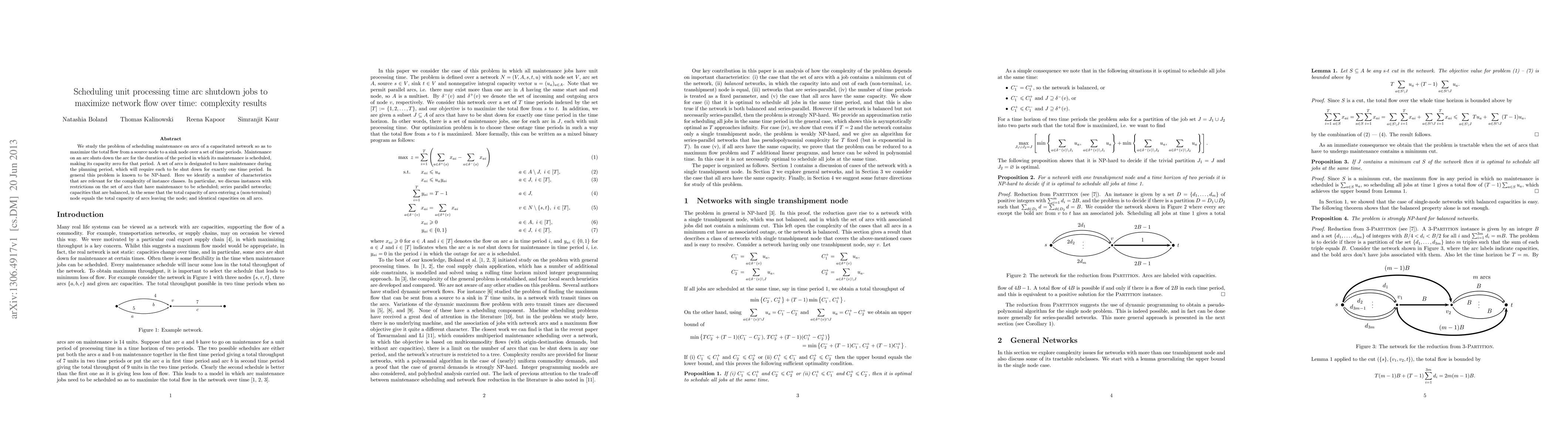 We study the problem of scheduling maintenance on arcs of a capacitated network so as to maximize the total flow from a source node to a sink node over a set of time periods. Maintenance on an arc shuts down the arc for the duration of the period in which its maintenance is scheduled, making its capacity zero for that period. A set of arcs is designated to have maintenance during the planning period, which will require each to be shut down for exactly one time period. In general this problem is known to be NP-hard. Here we identify a number of characteristics that are relevant for the complexity of instance classes. In particular, we discuss instances with restrictions on the set of arcs that have maintenance to be scheduled; series parallel networks; capacities that are balanced, in the sense that the total capacity of arcs entering a (non-terminal) node equals the total capacity of arcs leaving the node; and identical capacities on all arcs.