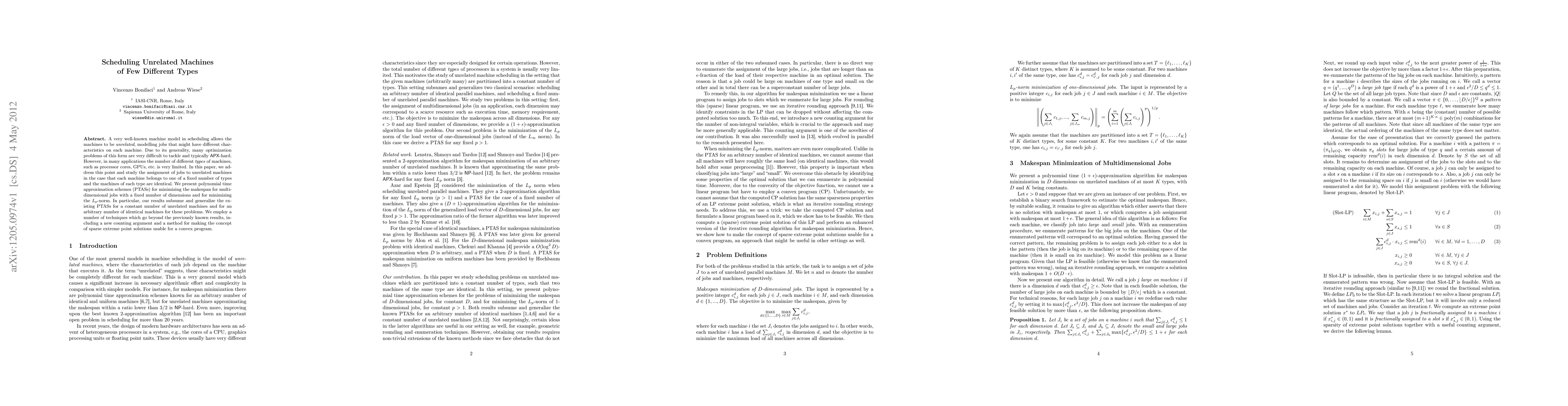 This paper develops polynomial time approximation schemes (PTASs) for scheduling unrelated machines of a few different types, focusing on minimizing makespan for multidimensional jobs and minimizing the L_p-norm. The authors introduce new techniques, including a counting argument and a method for utilizing sparse extreme points in convex programming, to generalize existing PTASs.