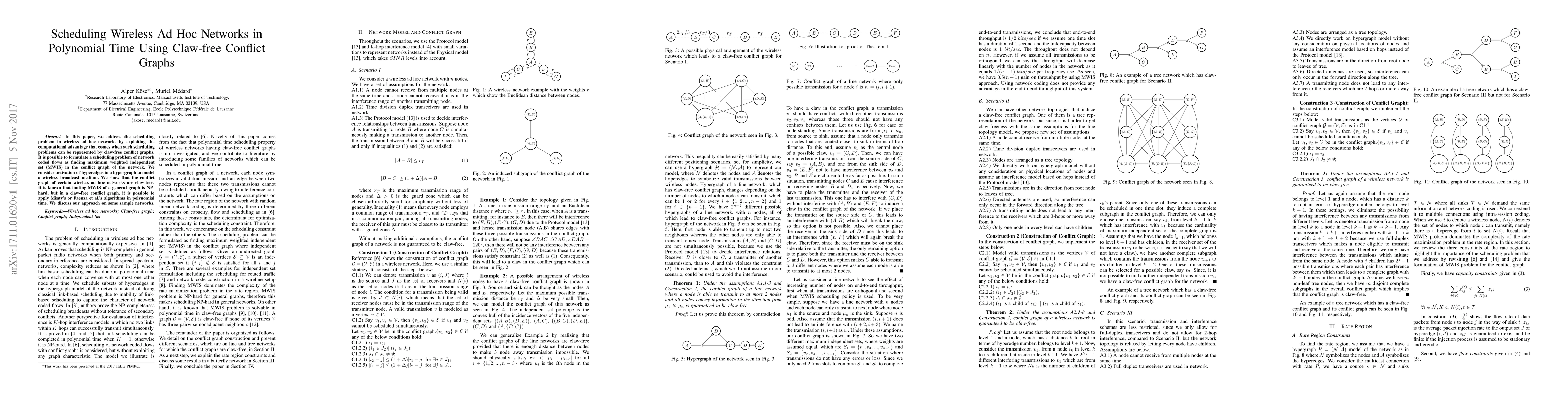This paper proposes a polynomial-time scheduling method for wireless ad hoc networks by representing scheduling problems using claw-free conflict graphs, which allows the application of efficient algorithms for finding maximum weighted independent set, thus overcoming the NP-hardness of general graphs. The study demonstrates the applicability of this approach on sample networks.