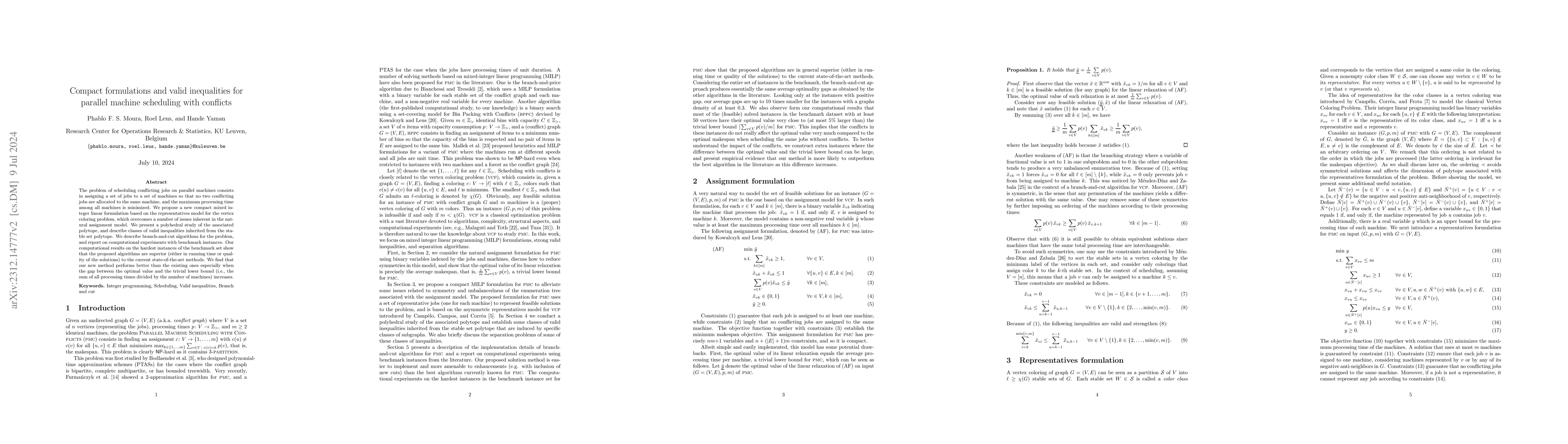 Given an undirected graph $G=(V,E)$ (i.e. the conflict graph) where $V$ is a set of $n$ vertices (representing the jobs), processing times $p \colon V \to \mathbb{Z}_>$, and $m\geq 2$ identical machines the Parallel Machine Scheduling with Conflicts (PMC) consists in finding an assignment $c \colon V \to [m]:=\{1,\ldots, m\}$ with $c(u)\neq c(v)$ for all $\{u,v\} \in E$ that minimizes the makespan $\max_{k \in [m]} \sum_{v \in V \colon c(v)=k} p(v)$. First we consider the natural assignment formulation for PMC using binary variables indexed by the jobs and machines, and discuss how to reduce the symmetries in such model. Then we propose a compact mixed integer linear programming formulation for PMC to tackle the issues related to symmetry and unbalanced enumeration tree associated with the assignment model. The proposed formulation for PMC uses a set of representative jobs (one in each machine) to express feasible solutions of the problem, and it is based on the representatives model for the vertex coloring problem. We present a polyhedral study of the associated polytope, and show classes of valid inequalities inherited from the stable set polytope. We describe branch-and-cut algorithms for PMC, and report on preliminary computational experiments with benchmark instances.