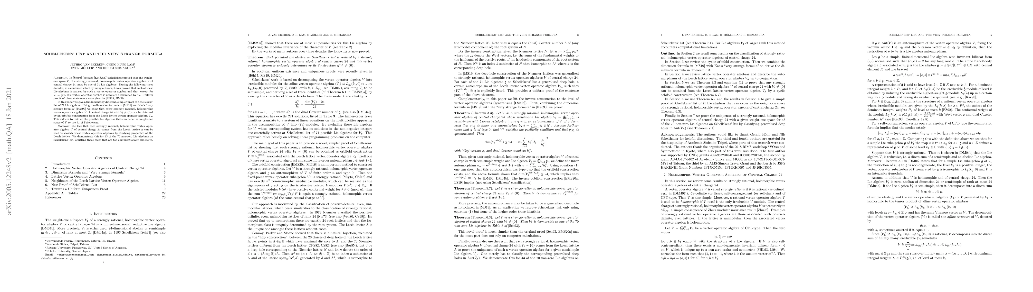 This paper presents a novel, simplified proof for Schellekens' list of 71 Lie algebras realized by weight-one spaces of strongly rational, holomorphic vertex operator algebras of central charge 24. The authors use the dimension formula and Kac's "very strange formula" to show that these algebras arise from orbifold constructions based on the Leech lattice vertex operator algebra, classifying 43 of them through properties of the Leech lattice.