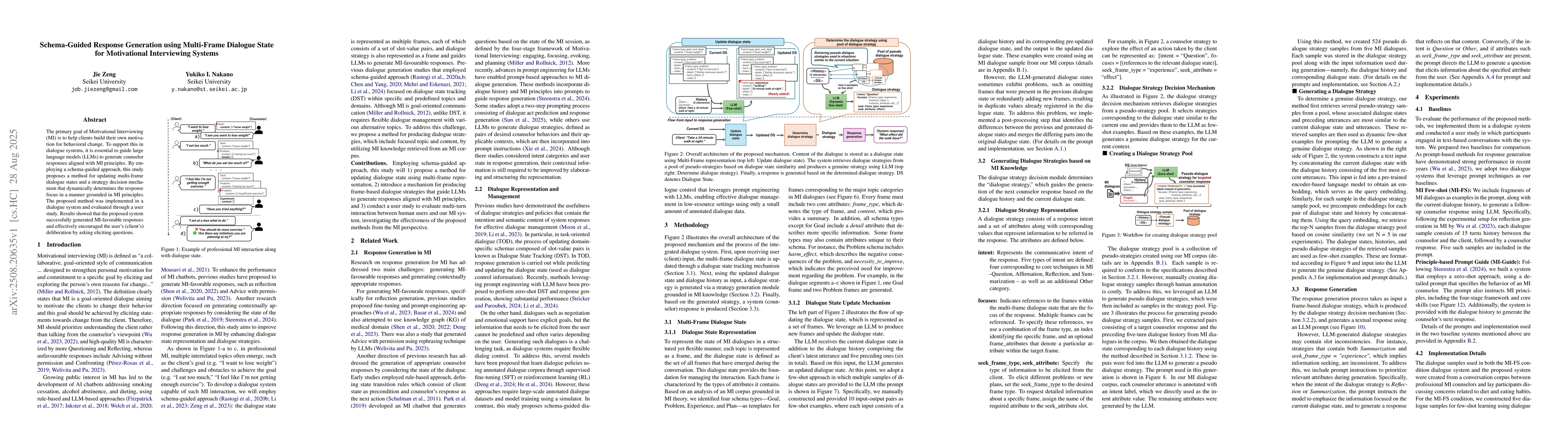 The primary goal of Motivational Interviewing (MI) is to help clients build their own motivation for behavioral change. To support this in dialogue systems, it is essential to guide large language models (LLMs) to generate counselor responses aligned with MI principles. By employing a schema-guided approach, this study proposes a method for updating multi-frame dialogue states and a strategy decision mechanism that dynamically determines the response focus in a manner grounded in MI principles. The proposed method was implemented in a dialogue system and evaluated through a user study. Results showed that the proposed system successfully generated MI-favorable responses and effectively encouraged the user's (client's) deliberation by asking eliciting questions.