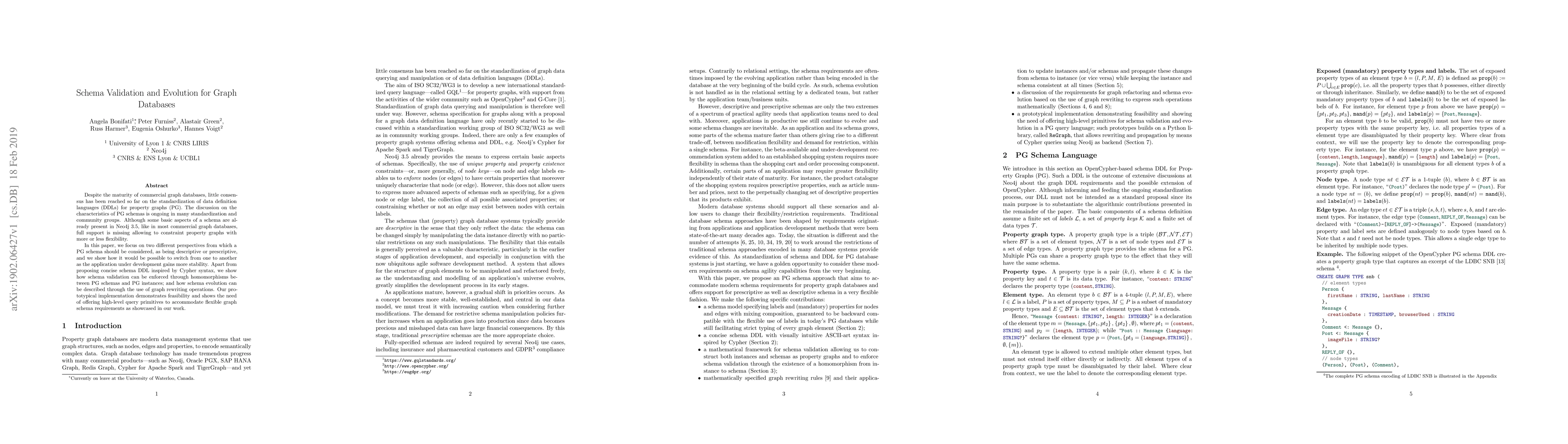Despite the maturity of commercial graph databases, little consensus has been reached so far on the standardization of data definition languages (DDLs) for property graphs (PG). The discussion on the characteristics of PG schemas is ongoing in many standardization and community groups. Although some basic aspects of a schema are already present in Neo4j 3.5, like in most commercial graph databases, full support is missing allowing to constraint property graphs with more or less flexibility. In this paper, we focus on two different perspectives from which a PG schema should be considered, as being descriptive or prescriptive, and we show how it would be possible to switch from one to another as the application under development gains more stability. Apart from proposing concise schema DDL inspired by Cypher syntax, we show how schema validation can be enforced through homomorphisms between PG schemas and PG instances; and how schema evolution can be described through the use of graph rewriting operations. Our prototypical implementation demonstrates feasibility and shows the need of offering high-level query primitives to accommodate flexible graph schema requirements as showcased in our work.