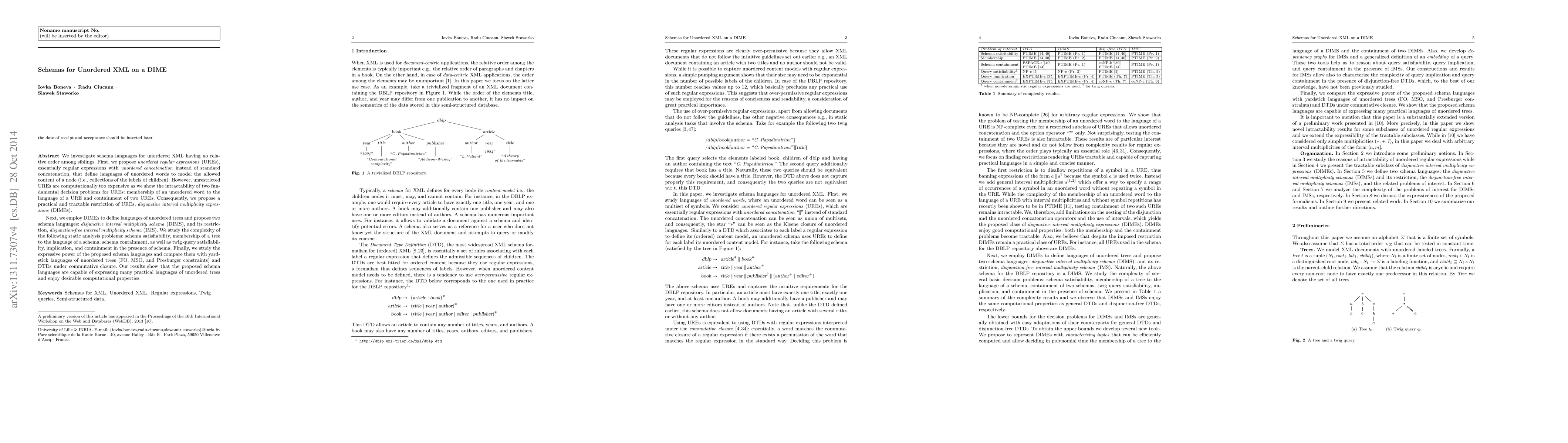 This paper proposes unordered regular expressions (UREs) to model unordered XML content and introduces disjunctive interval multiplicity expressions (DIMEs) as a tractable restriction. It defines two schema languages, DIMS and IMS, and studies their complexity and expressive power, demonstrating their practical applicability and computational efficiency compared to other schema languages.