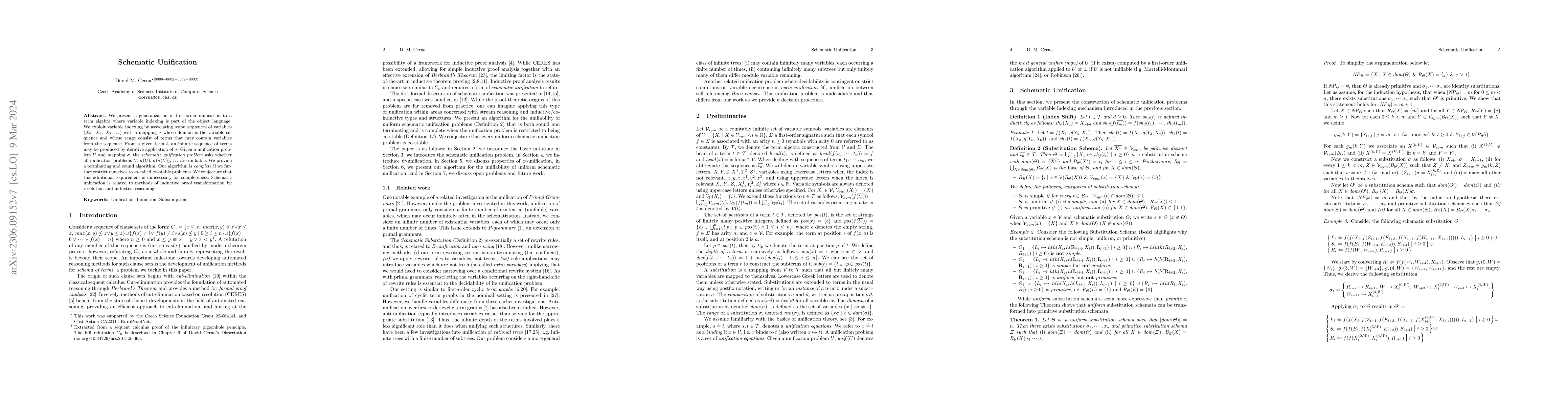 This paper generalizes first-order unification to a term algebra with variable indexing, proposing a method to iteratively generate terms using a mapping. It presents a terminating and sound algorithm for solving schematic unification problems and suggests completeness under certain restrictions, hypothesizing that these may not be necessary.
