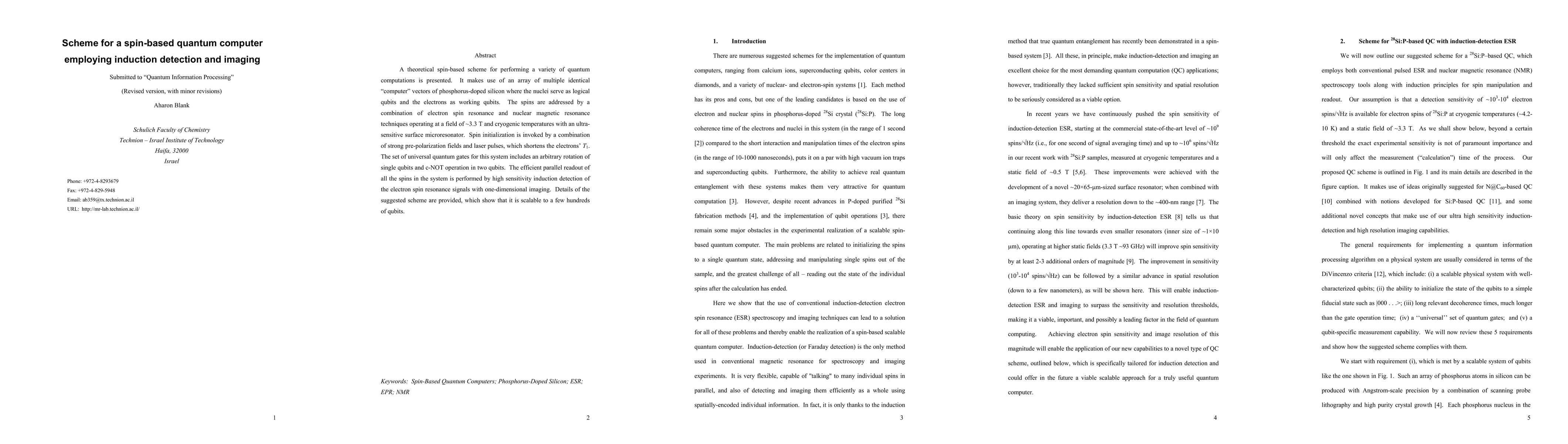 This paper proposes a theoretical spin-based quantum computing scheme utilizing phosphorus-doped silicon for qubits, employing electron and nuclear spins for computation. It achieves scalable quantum operations through electron spin resonance and nuclear magnetic resonance techniques at cryogenic temperatures, with efficient parallel readout via induction detection and imaging.