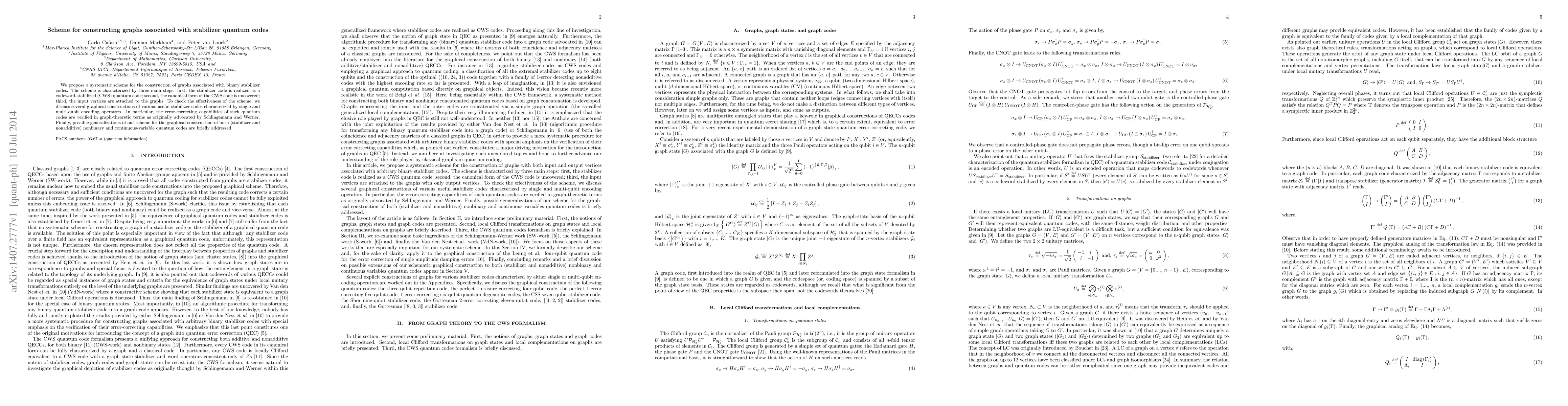 We propose a systematic scheme for the construction of graphs associated with binary stabilizer codes. The scheme is characterized by three main steps: first, the stabilizer code is realized as a codeword-stabilized (CWS) quantum code; second, the canonical form of the CWS code is uncovered; third, the input vertices are attached to the graphs. To check the effectiveness of the scheme, we discuss several graphical constructions of various useful stabilizer codes characterized by single and multi-qubit encoding operators. In particular, the error-correcting capabilities of such quantum codes are verified in graph-theoretic terms as originally advocated by Schlingemann and Werner. Finally, possible generalizations of our scheme for the graphical construction of both (stabilizer and nonadditive) nonbinary and continuous-variable quantum codes are briefly addressed.