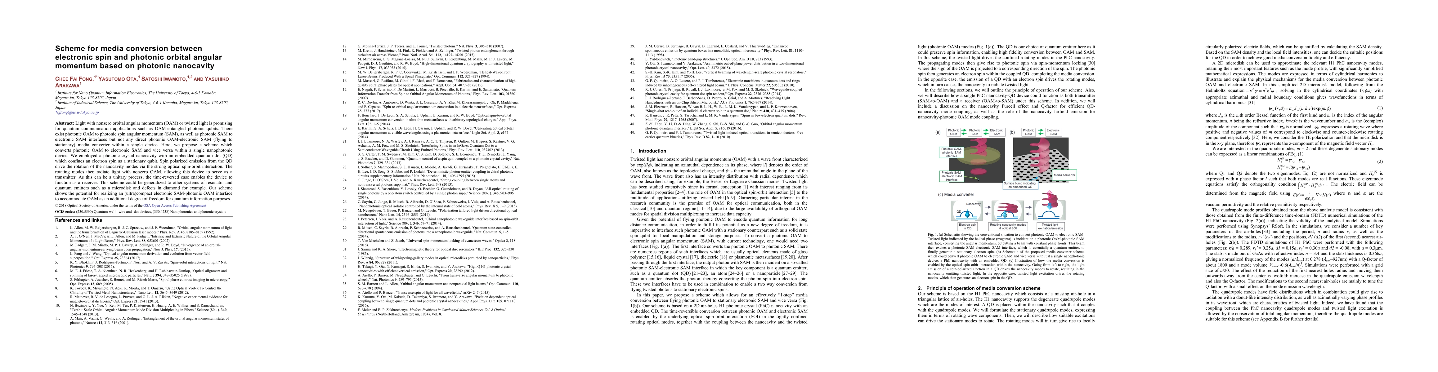 This paper proposes a nanophotonic device using a photonic crystal nanocavity with an embedded quantum dot to convert photonic orbital angular momentum to electronic spin angular momentum and vice versa, enabling an ultracompact interface for quantum communication applications. The device leverages strong optical spin-orbit interaction to achieve this conversion, showing potential for compact quantum information systems.