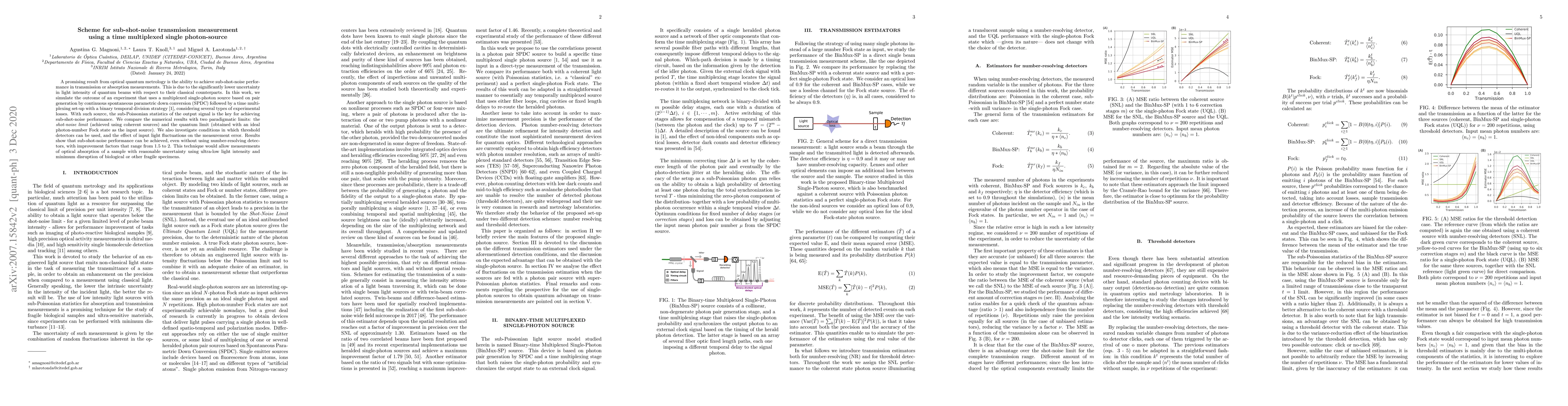 A promising result from optical quantum metrology is the ability to achieve sub-shot-noise performance in transmission or absorption measurements. This is due to the significantly lower uncertainty in light intensity of quantum beams with respect to their classical counterparts. In this work, we simulate the outcome of an experiment that uses a multiplexed single-photon source based on pair generation by continuous spontaneous parametric down conversion (SPDC) followed by a time multiplexing set-up with a binary temporal division strategy, considering several types of experimental losses. With such source, the sub-Poissonian statistics of the output signal is the key for achieving sub-shot-noise performance. We compare the numerical results with two paradigmatic limits: the shot-noise limit (achieved using coherent sources) and the quantum limit (obtained with an ideal photon-number Fock state as the input source). We also investigate conditions in which threshold detectors can be used, and the effect of input light fluctuations on the measurement error. Results show that sub-shot-noise performance can be achieved, even without using number-resolving detectors, with improvement factors that range from 1.5 to 2. This technique would allow measurements of optical absorption of a sample with reasonable uncertainty using ultra-low light intensity and minimum disruption of biological or other fragile specimens.