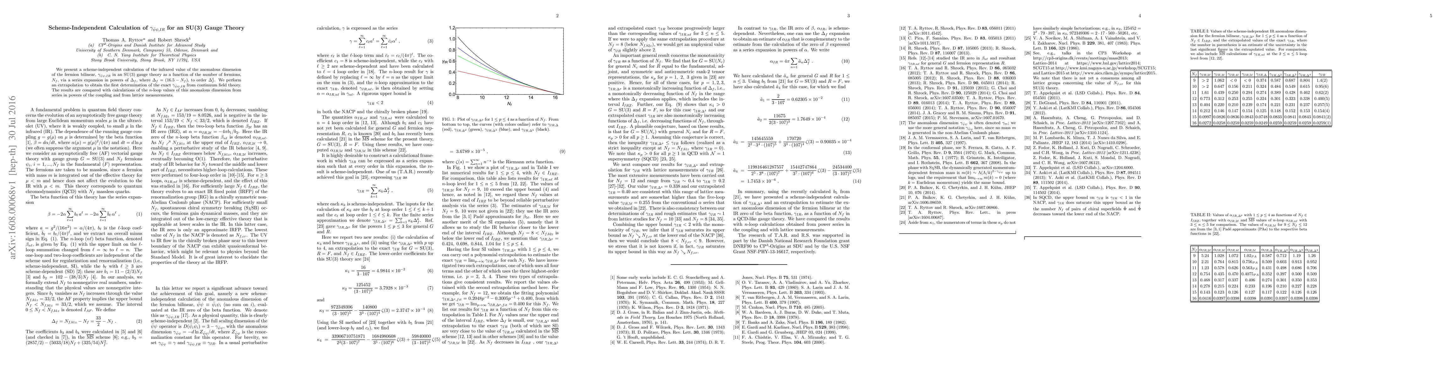 This paper presents a scheme-independent calculation of the infrared anomalous dimension $\gamma_{\bar\psi\psi,IR}$ in SU(3) gauge theory, determined via a series expansion in $\Delta_f$ up to $\Delta_f^4$. The study extrapolates to find the exact value from continuum field theory, comparing results with loop calculations and lattice measurements.