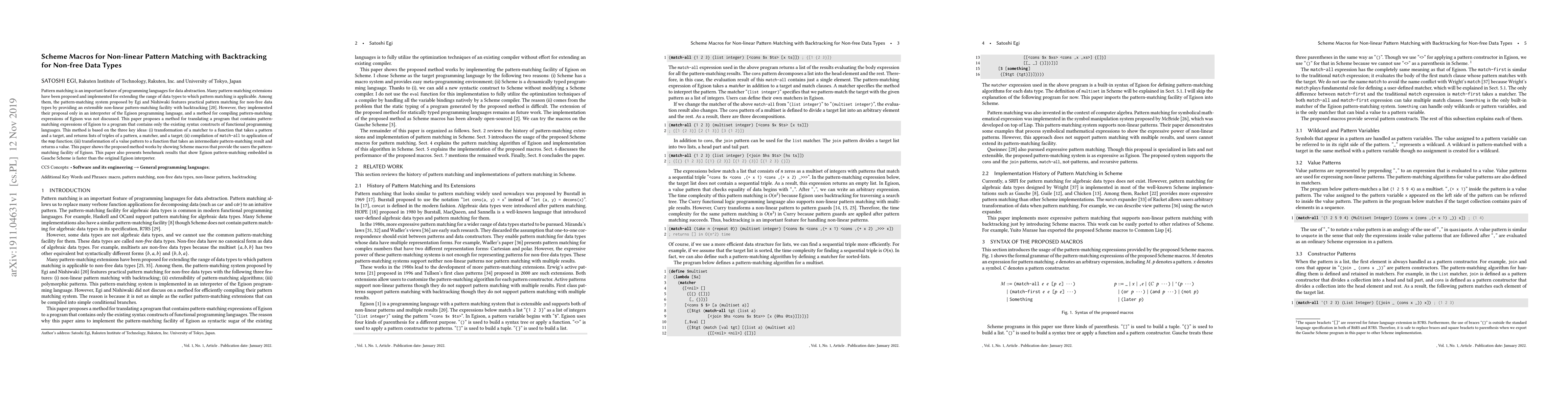 This paper proposes a method to compile pattern-matching expressions from Egison into functional programming constructs, demonstrating it through Scheme macros. The method involves transforming matchers, compiling match-all operations, and converting value patterns, showing improved performance compared to the original Egison interpreter.
