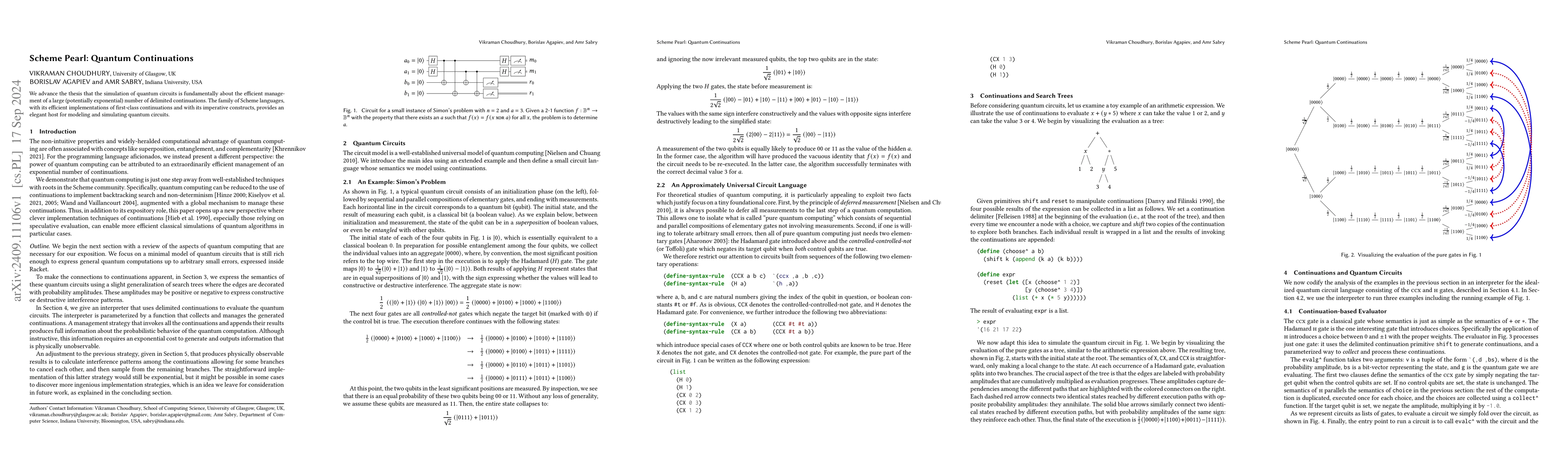 Summary: This paper argues that efficient simulation of quantum circuits hinges on managing numerous delimited continuations, and utilizes Scheme languages, known for their effective first-class continuations and imperative constructs, to elegantly model and simulate quantum circuits.