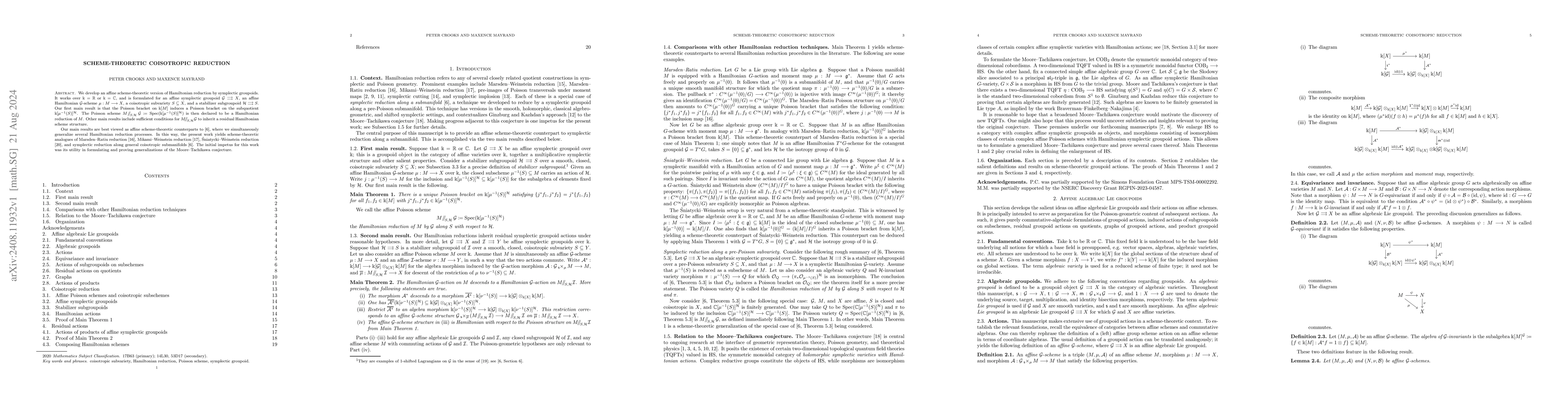 This paper develops an affine scheme-theoretic Hamiltonian reduction via symplectic groupoids, showing that the Poisson bracket on the original space induces a bracket on the reduced space. The results generalize previous Hamiltonian reduction methods and provide a basis for proving generalizations of the Moore-Tachikawa conjecture.