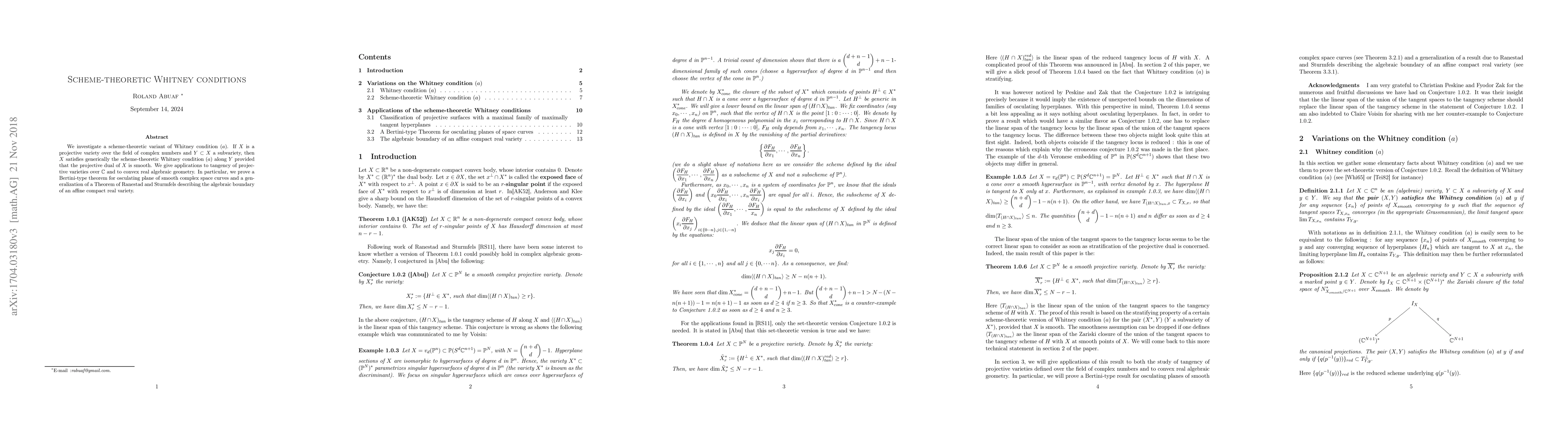 Summary: This paper explores a scheme-theoretic version of Whitney's condition a, demonstrating its application to tangency of projective varieties over the complex numbers. It proves a Bertini-type theorem for osculating planes of smooth curves and generalizes a theorem on the algebraic boundary in real algebraic geometry.