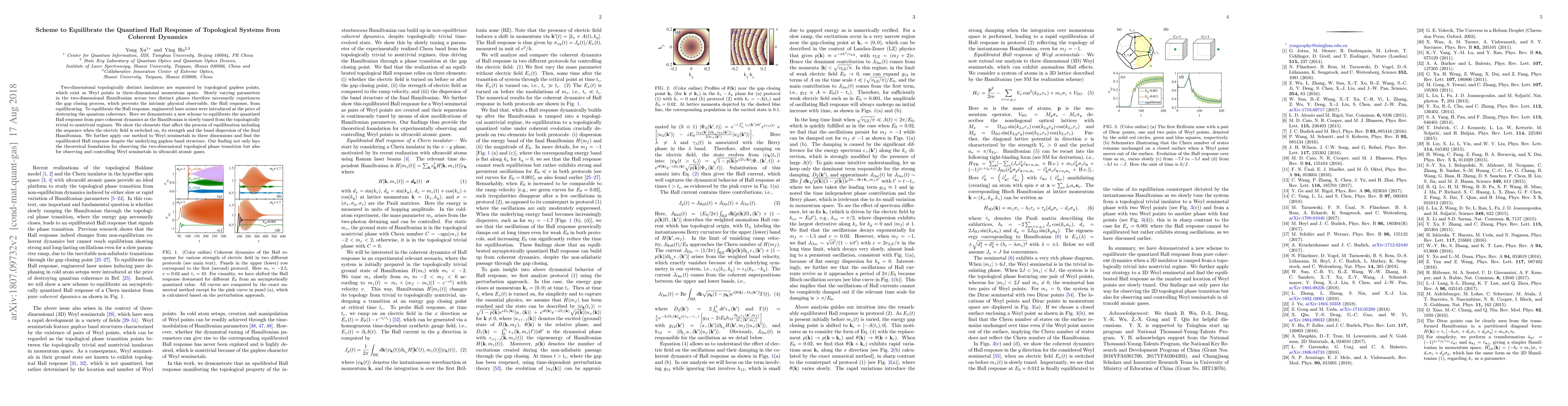 Two-dimensional topologically distinct insulators are separated by topological gapless points, which exist as Weyl points in three-dimensional momentum space. Slowly varying parameters in the two-dimensional Hamiltonian across two distinct phases therefore necessarily experiences the gap closing process, which prevents the intrinsic physical observable, the Hall response, from equilibrating. To equilibrate the Hall response, engineered laser noises were introduced at the price of destroying the quantum coherence. Here we demonstrate a new scheme to equilibrate the quantized Hall response from pure coherent dynamics as the Hamiltonian is slowly tuned from the topologically trivial to nontrivial regimes. We show the elements that affect the process of equilibration including the sequence when the electric field is switched on, its strength and the band dispersion of the final Hamiltonian. We further apply our method to Weyl semimetals in three dimensions and find the equilibrated Hall response despite the underlying gapless band structure. Our finding not only lays the theoretical foundation for observing the two-dimensional topological phase transition but also for observing and controlling Weyl semimetals in ultracold atomic gases.