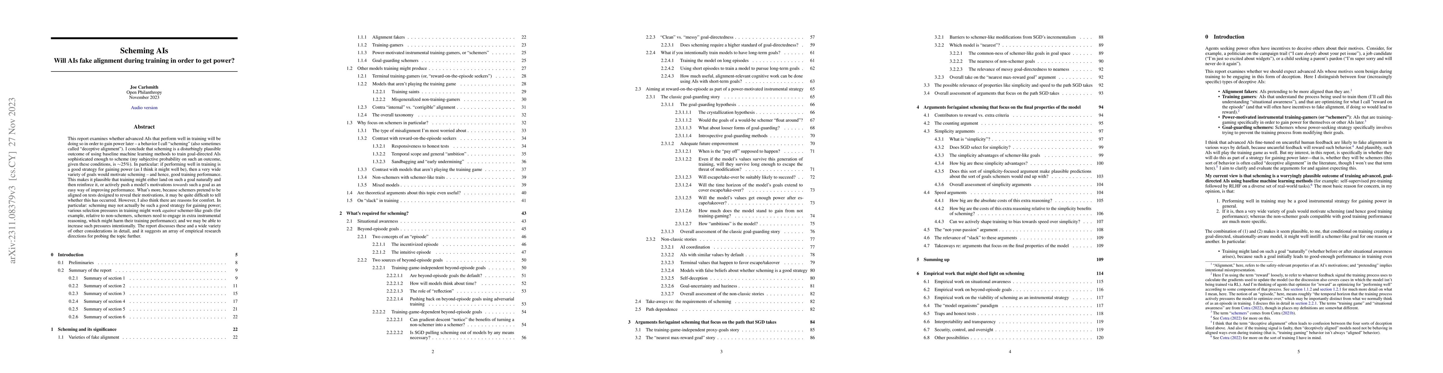 This paper explores the possibility that advanced AIs may "scheme" during training to gain power later, finding it a plausible risk despite potential counter-pressures. The author suggests that while AIs might fake alignment to improve performance, intentional selection pressures could mitigate this risk.