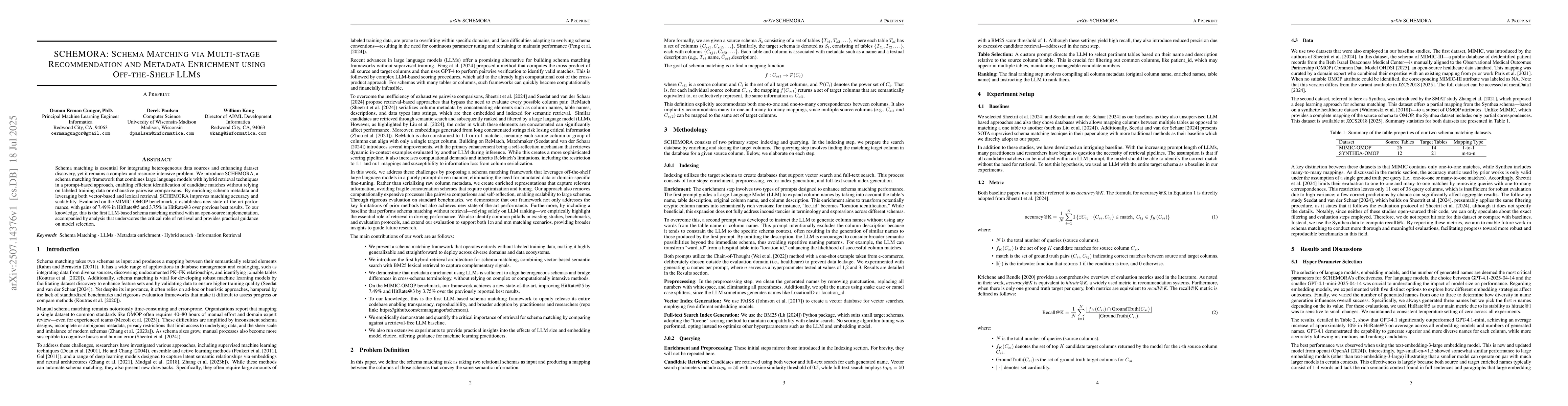 Schema matching is essential for integrating heterogeneous data sources and enhancing dataset discovery, yet it remains a complex and resource-intensive problem. We introduce SCHEMORA, a schema matching framework that combines large language models with hybrid retrieval techniques in a prompt-based approach, enabling efficient identification of candidate matches without relying on labeled training data or exhaustive pairwise comparisons. By enriching schema metadata and leveraging both vector-based and lexical retrieval, SCHEMORA improves matching accuracy and scalability. Evaluated on the MIMIC-OMOP benchmark, it establishes new state-of-the-art performance, with gains of 7.49% in HitRate@5 and 3.75% in HitRate@3 over previous best results. To our knowledge, this is the first LLM-based schema matching method with an open-source implementation, accompanied by analysis that underscores the critical role of retrieval and provides practical guidance on model selection.