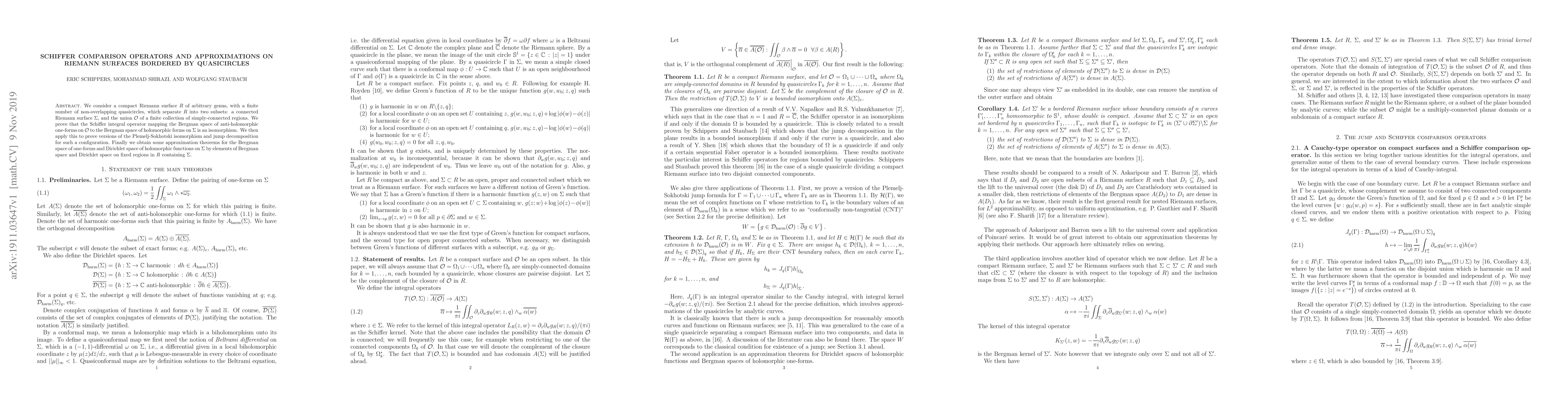 We consider a compact Riemann surface $R$ of arbitrary genus, with a finite number of non-overlapping quasicircles, which separate $R$ into two subsets: a connected Riemann surface $\Sigma$, and the union $\mathcal{O}$ of a finite collection of simply-connected regions. We prove that the Schiffer integral operator mapping the Bergman space of anti-holomorphic one-forms on $\mathcal{O}$ to the Bergman space of holomorphic forms on $\Sigma$ is an isomorphism. We then apply this to prove versions of the Plemelj-Sokhotski isomorphism and jump decomposition for such a configuration. Finally we obtain some approximation theorems for the Bergman space of one-forms and Dirichlet space of holomorphic functions on $\Sigma$ by elements of Bergman space and Dirichlet space on fixed regions in $R$ containing $\Sigma$.