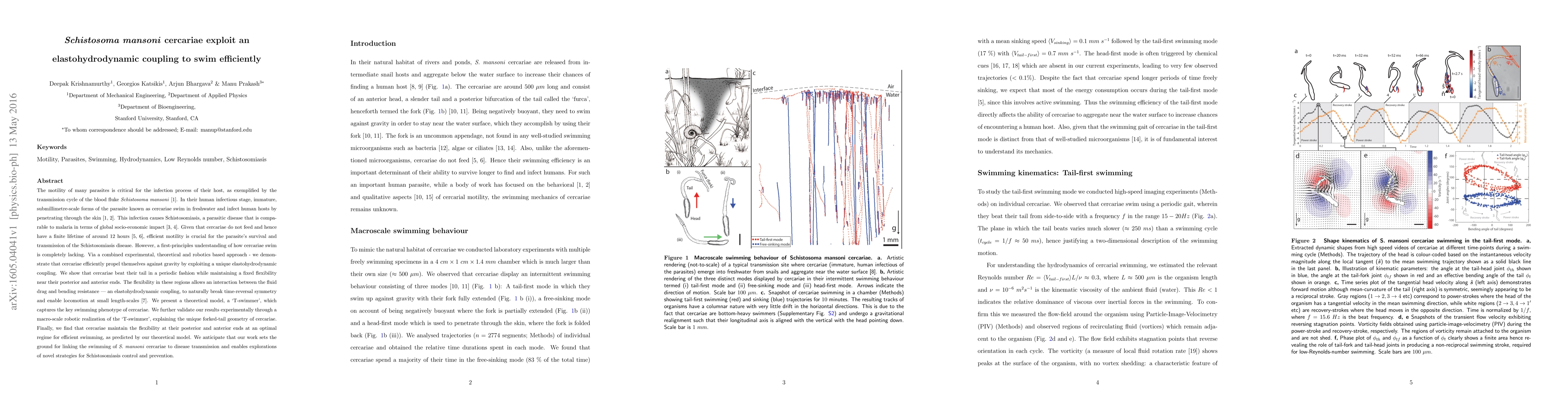 Schistosoma mansoni cercariae use an elastohydrodynamic coupling to swim efficiently against gravity, with a unique forked-tail geometry that enables them to maintain flexibility and overcome fluid drag.