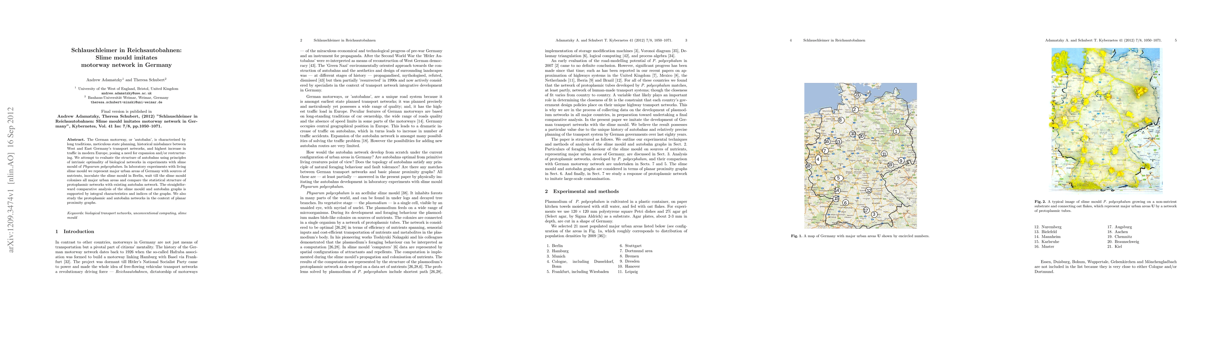 This study investigates whether the slime mould Physarum polycephalum can mimic the structure of Germany's autobahn network by simulating urban areas with nutrient sources. The comparative analysis reveals similarities between the slime mould's protoplasmic network and the autobahn's statistical structure, suggesting biological principles may inform transportation planning.