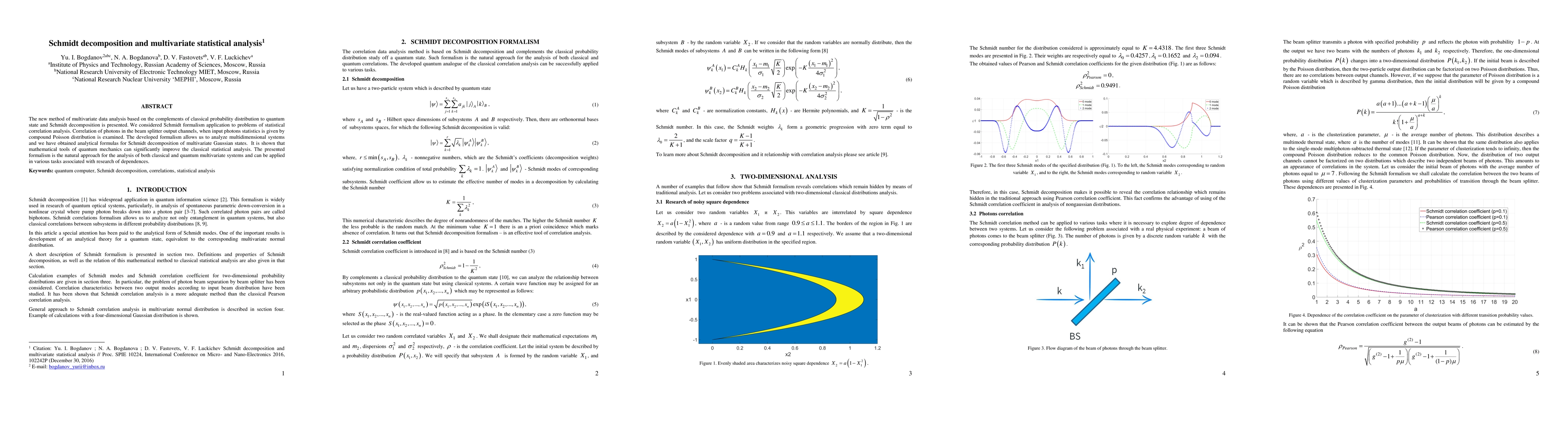 The new method of multivariate data analysis based on the complements of classical probability distribution to quantum state and Schmidt decomposition is presented. We considered Schmidt formalism application to problems of statistical correlation analysis. Correlation of photons in the beam splitter output channels, when input photons statistics is given by compound Poisson distribution is examined. The developed formalism allows us to analyze multidimensional systems and we have obtained analytical formulas for Schmidt decomposition of multivariate Gaussian states. It is shown that mathematical tools of quantum mechanics can significantly improve the classical statistical analysis. The presented formalism is the natural approach for the analysis of both classical and quantum multivariate systems and can be applied in various tasks associated with research of dependences.